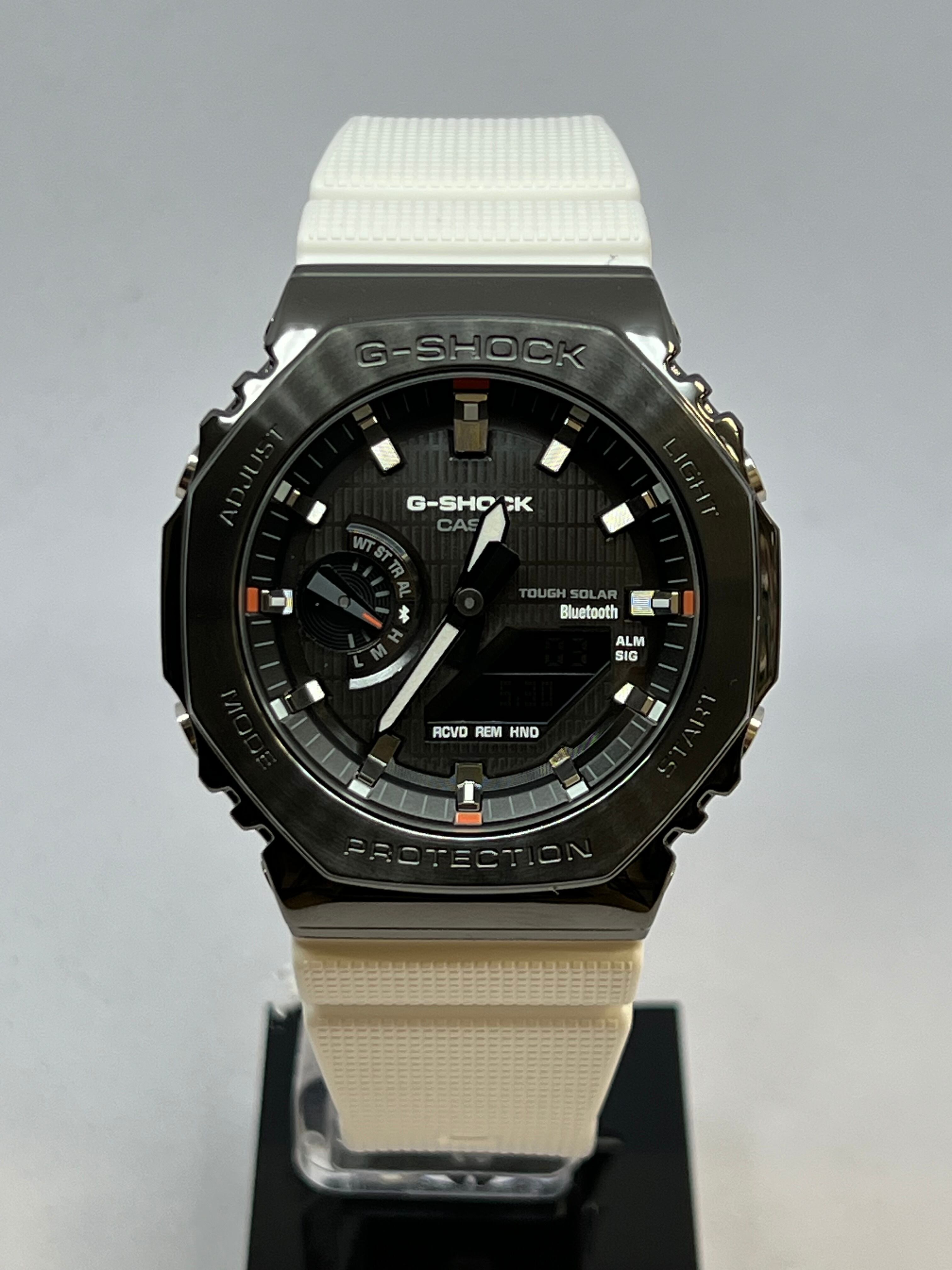 1983年の発売以来、飽くなき強さを求めて進化を続けるタフネスウオッチG-SHOCKから、2100シリーズの特徴であるスリムなサイズ感をキープしながら、スマートフォンリンクとタフソーラーを搭載したメタルベゼルのモデルです。