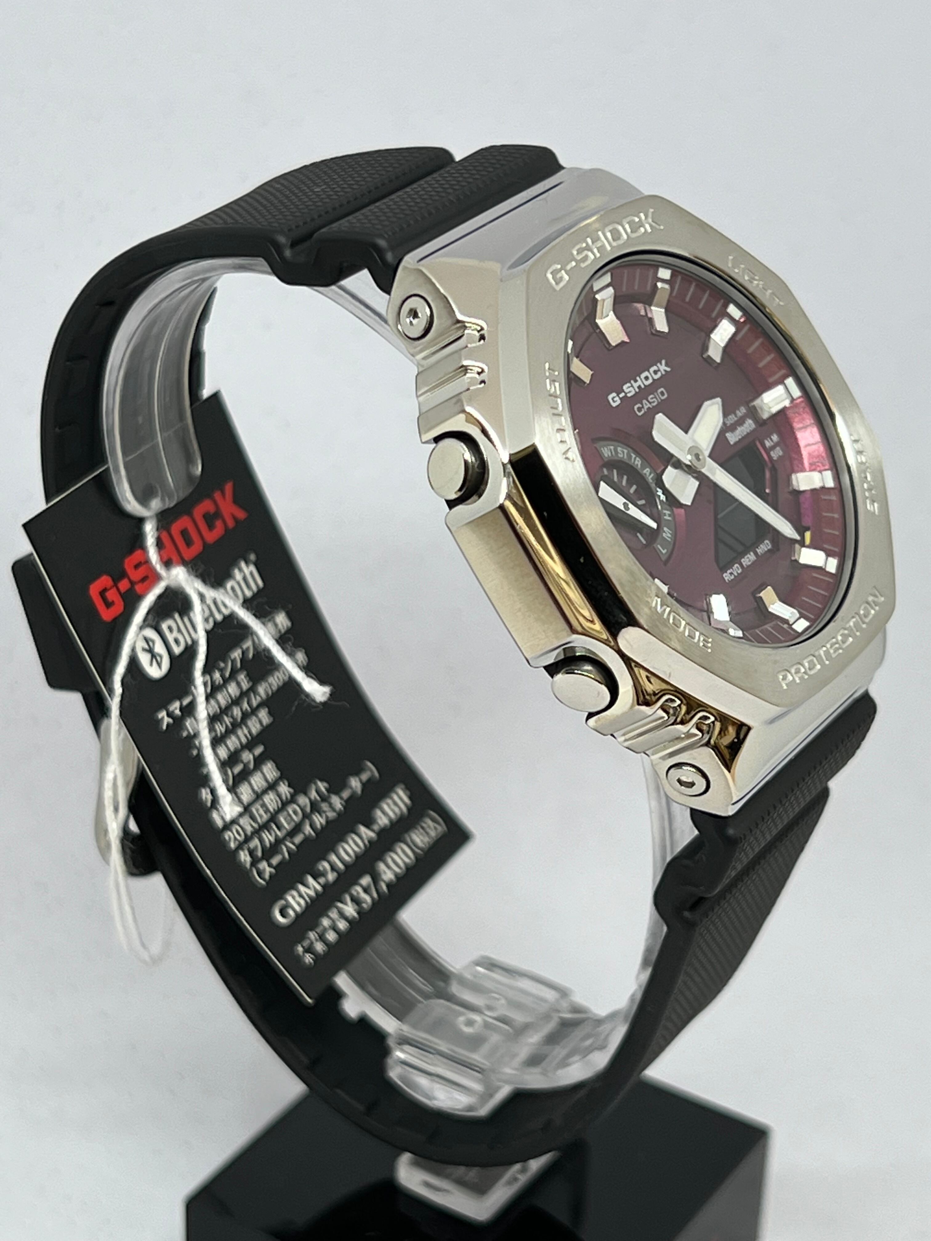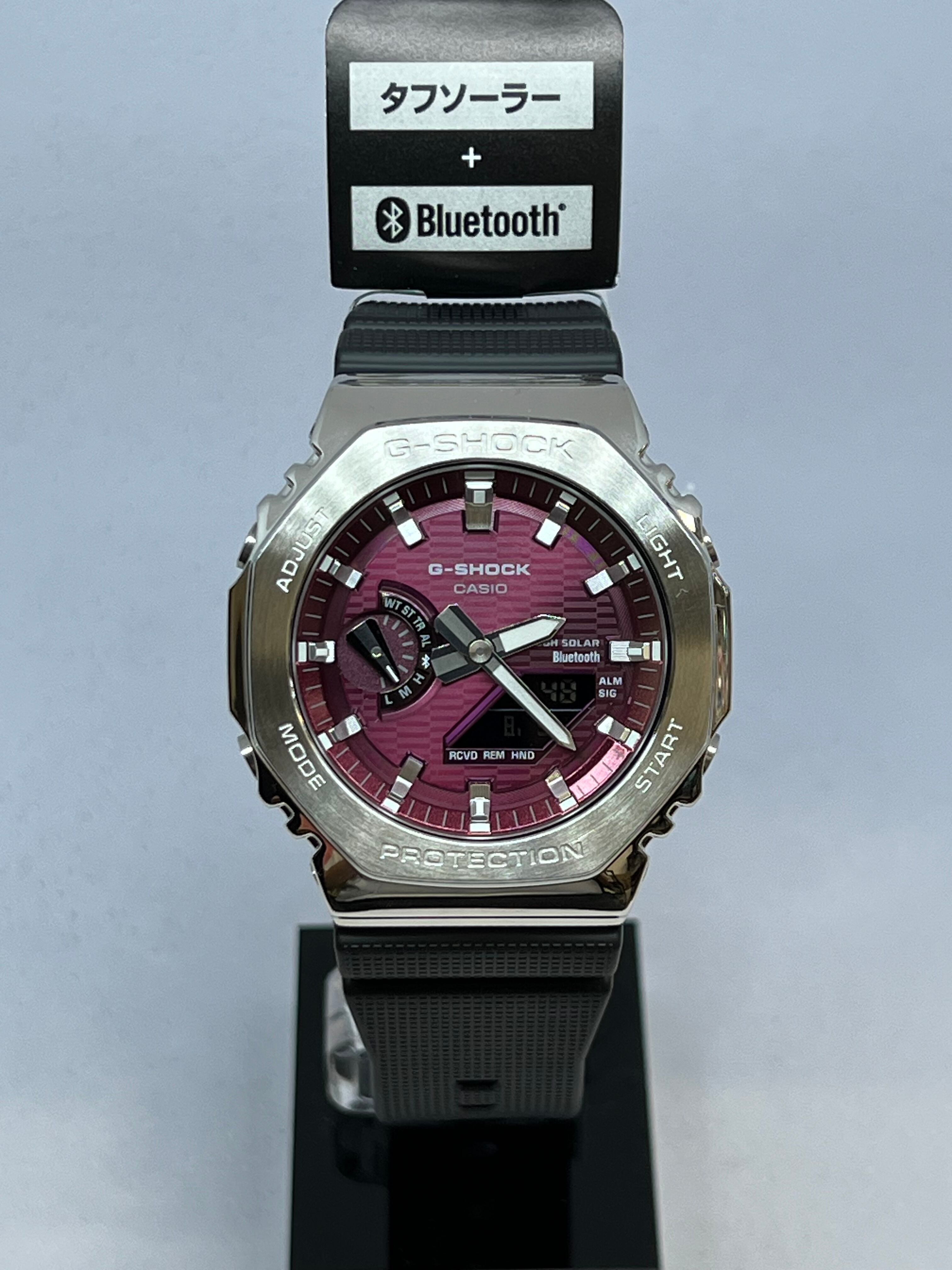1983年の発売以来、飽くなき強さを求めて進化を続けるタフネスウオッチG-SHOCKから、2100シリーズの特徴であるスリムなサイズ感をキープしながら、スマートフォンリンクとタフソーラーを搭載したメタルベゼルのモデルです。ケース、バンドの主な樹脂パーツにはバイオマスプラスチックを採用し、環境にも配慮しました。