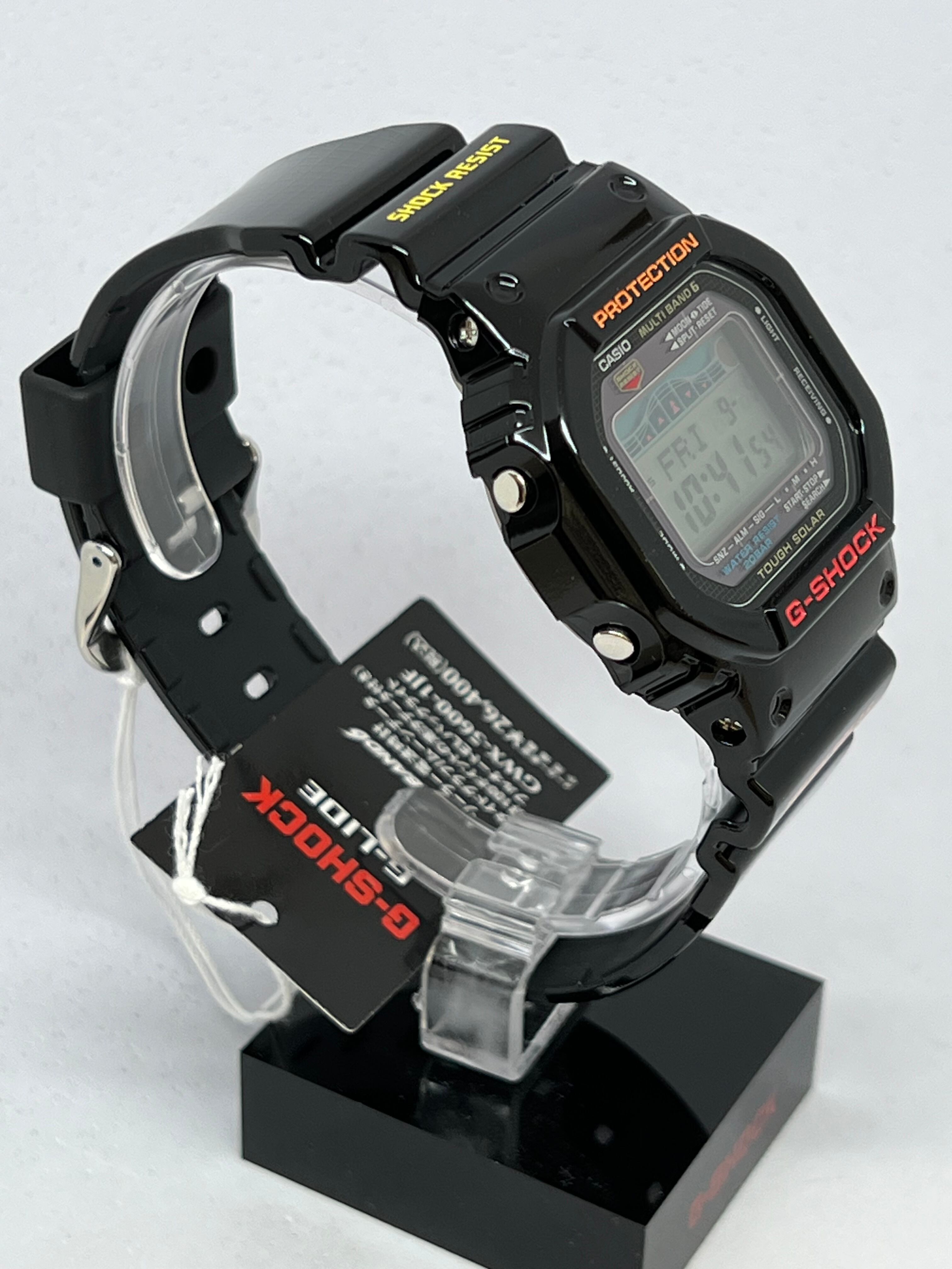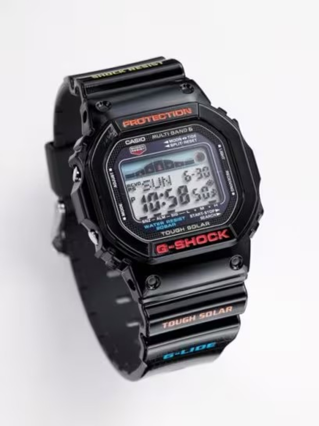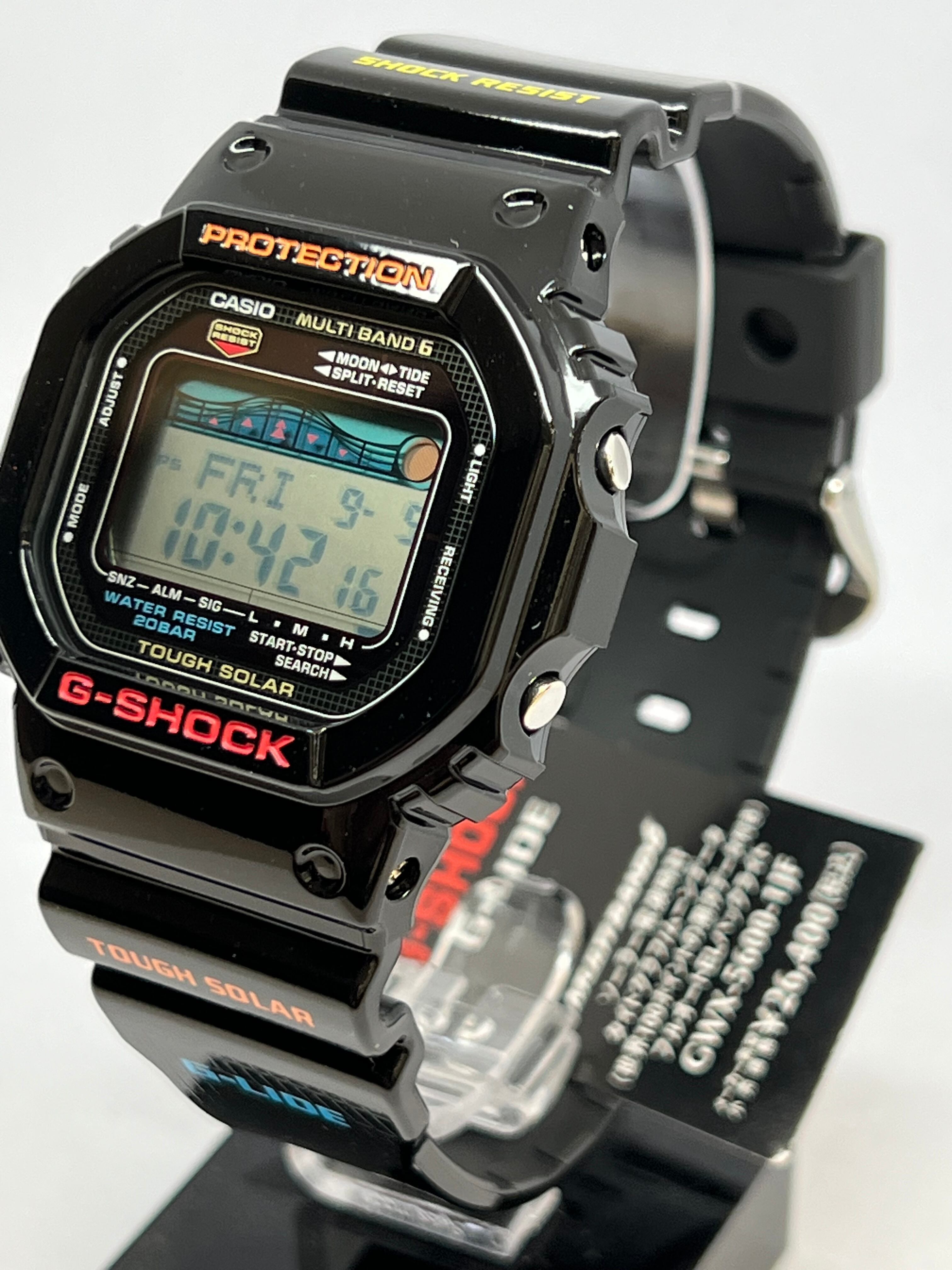 世界6局の標準電波を受信する電波ソーラー機能を搭載。世界の主要潮汐ポイント100箇所のタイドグラフ&ムーンデータ情報を予めセットしており、世界中の海でサーフィンが楽しめます。コンパクトな5600型のブラックボディに光沢塗装を施し、上質感のあるミラー加工メタルパーツを採用。バンドにはインパクトのあるグリッド状のデザインをプリントしました。