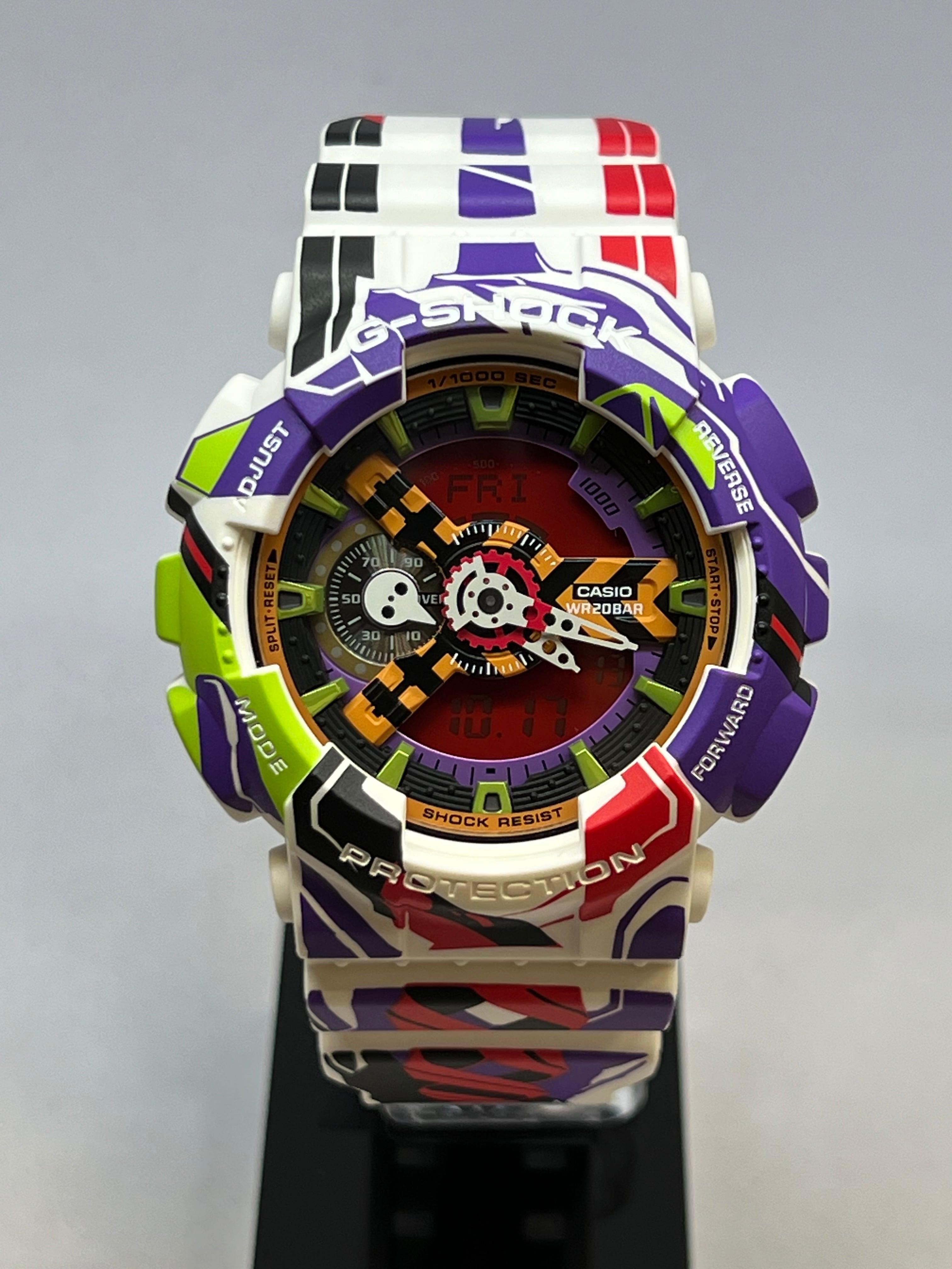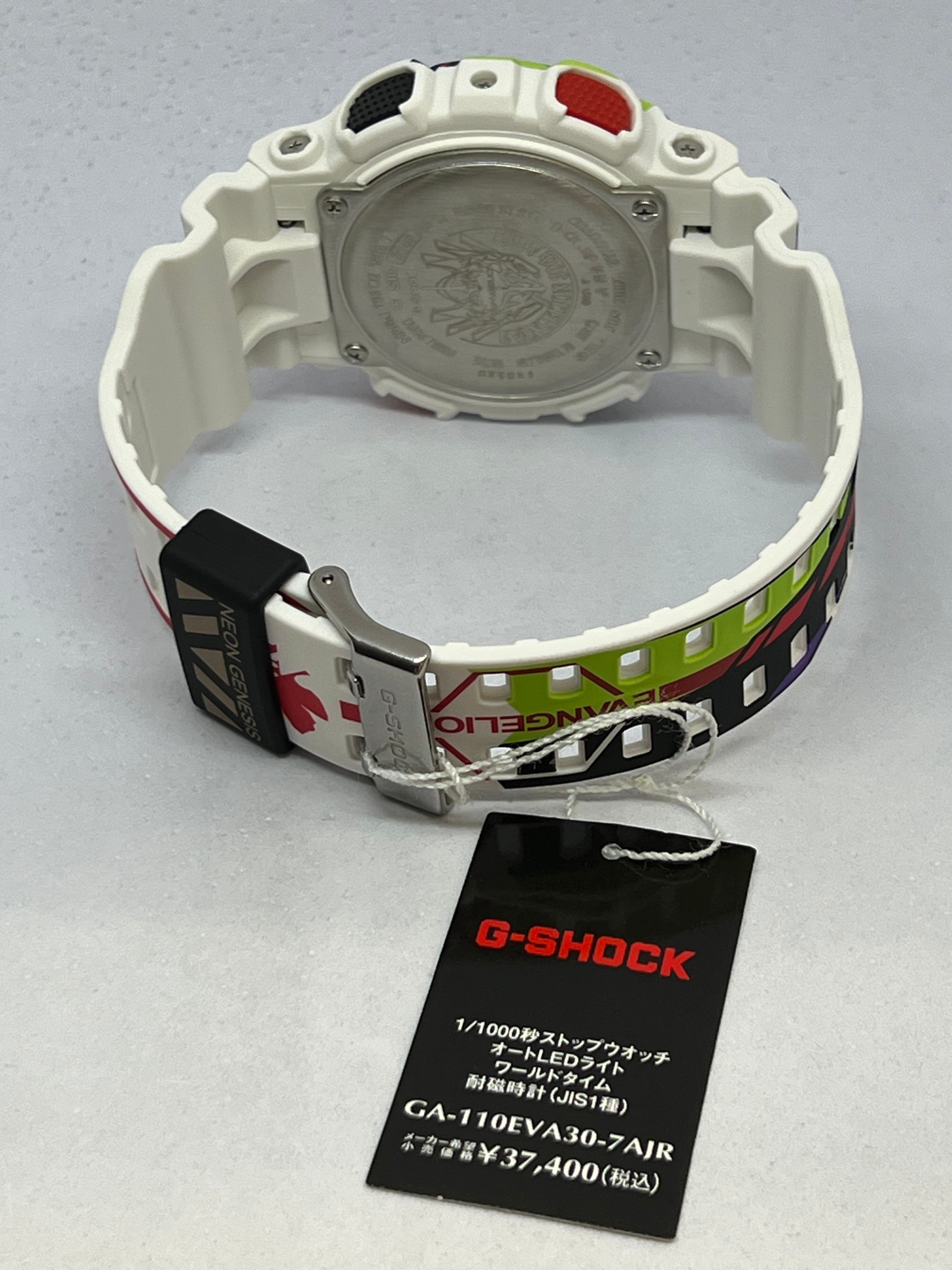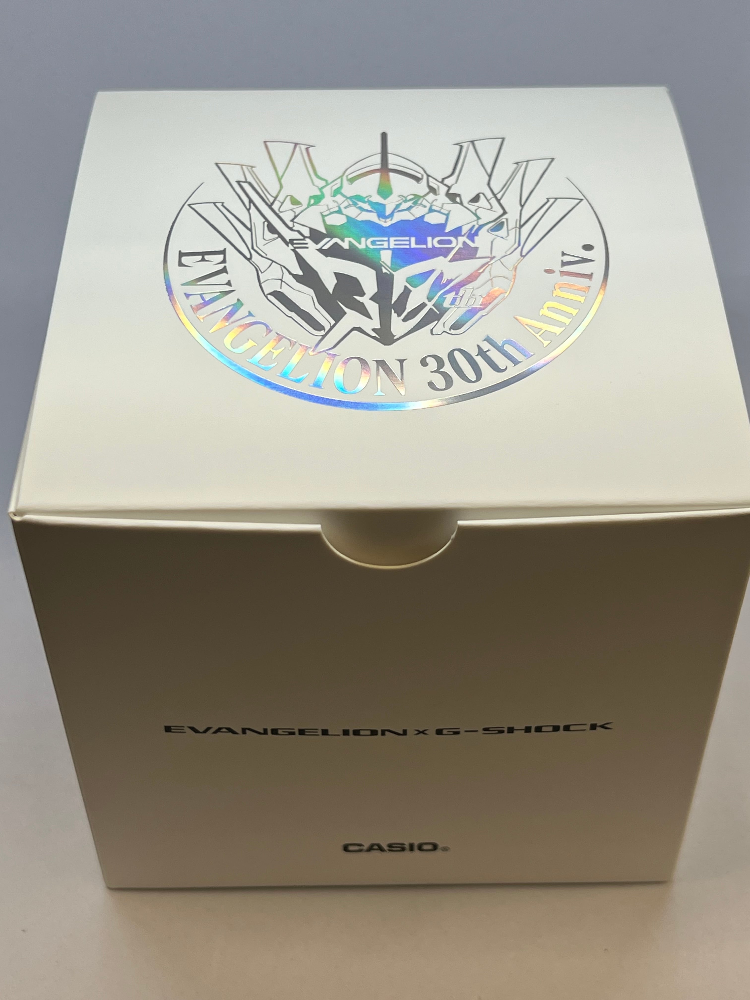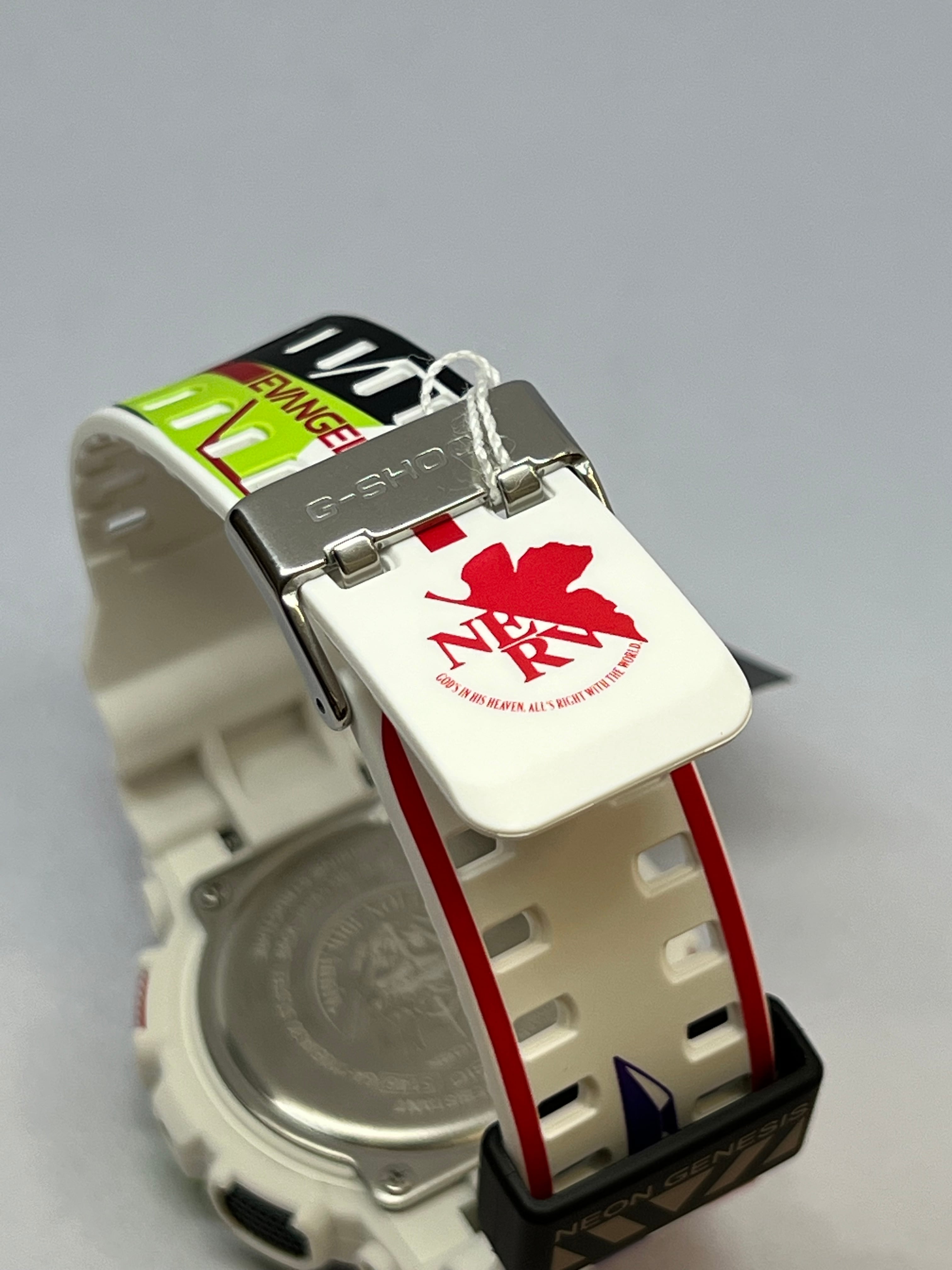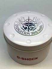 G-SHOCK全体にエヴァンゲリオン初号機が描かれ、12時側のバンドには初号機の頭部装備である角、ベゼル部分には初号機の顔、ベゼル下部から6時側のバンドにかけてはロンギヌスの槍を投擲しようとする左腕がデザインされています。