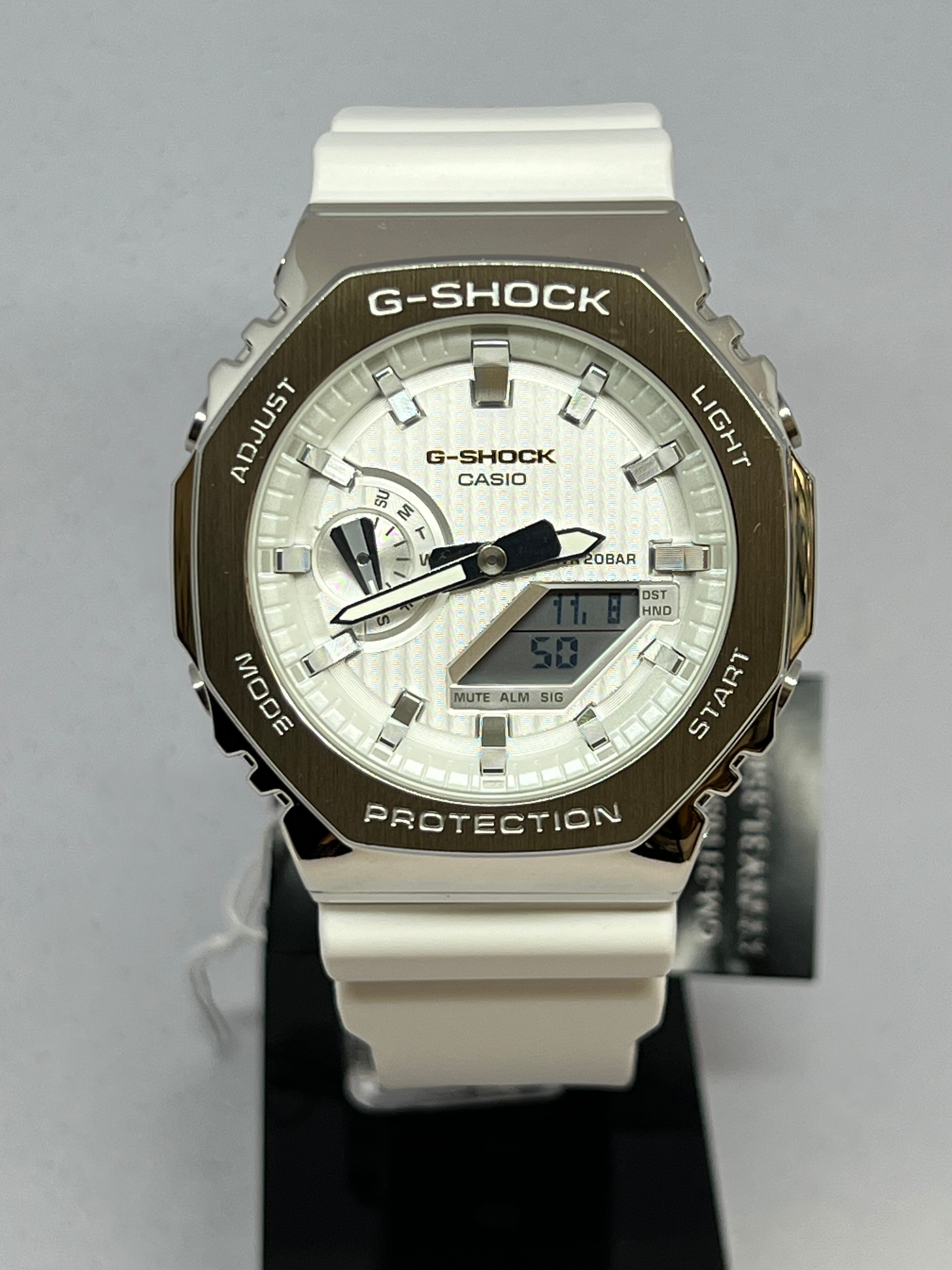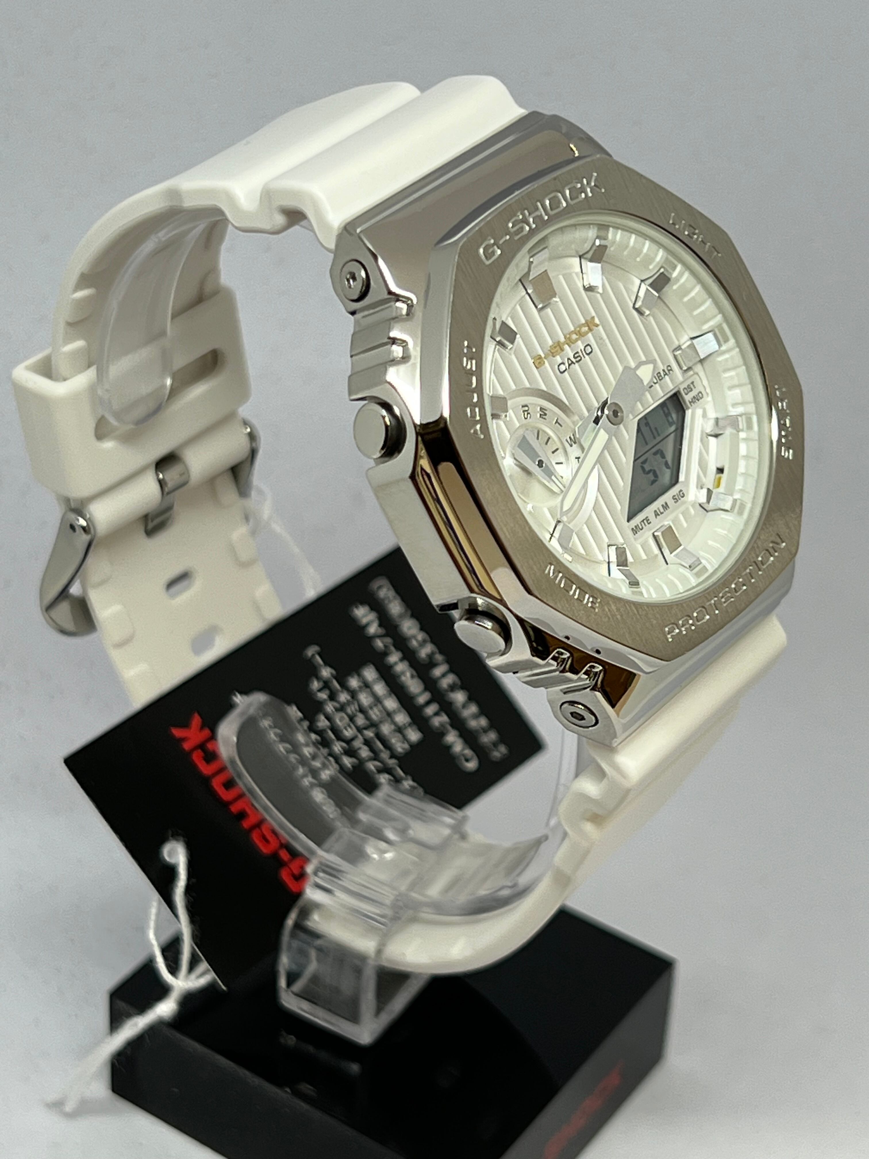 「流れ星」をイメージしたホワイトモデルで、文字板のG-SHOCKのロゴのゴールドは星の輝きを、文字板上のストライプパターンは星が降り注ぐ様子を表現しています。