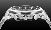 ロゴを排したベゼルは光の角度で表情を変え豊かな質感を演出。ステンレススチール製のバンドにはヘアライン仕上げとミラー仕上げを施し、三つ折れ式中留は端正なデザインとホールドが魅力です。