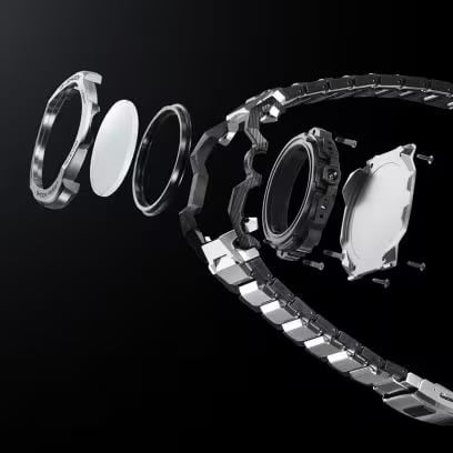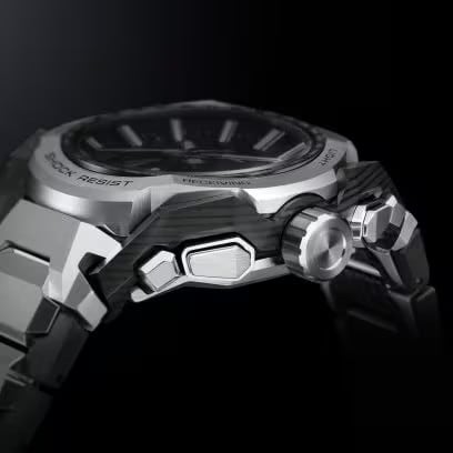 バンドは、ステンレススチールとカーボンファイバー強化樹脂を組み合わせたレイヤーコンポジットバンド。裏蓋は、粉末状の金属を射出成形するMIM(メタルインジェクションモールディング)成形により立体的に成形され、ケースを保護しています。
