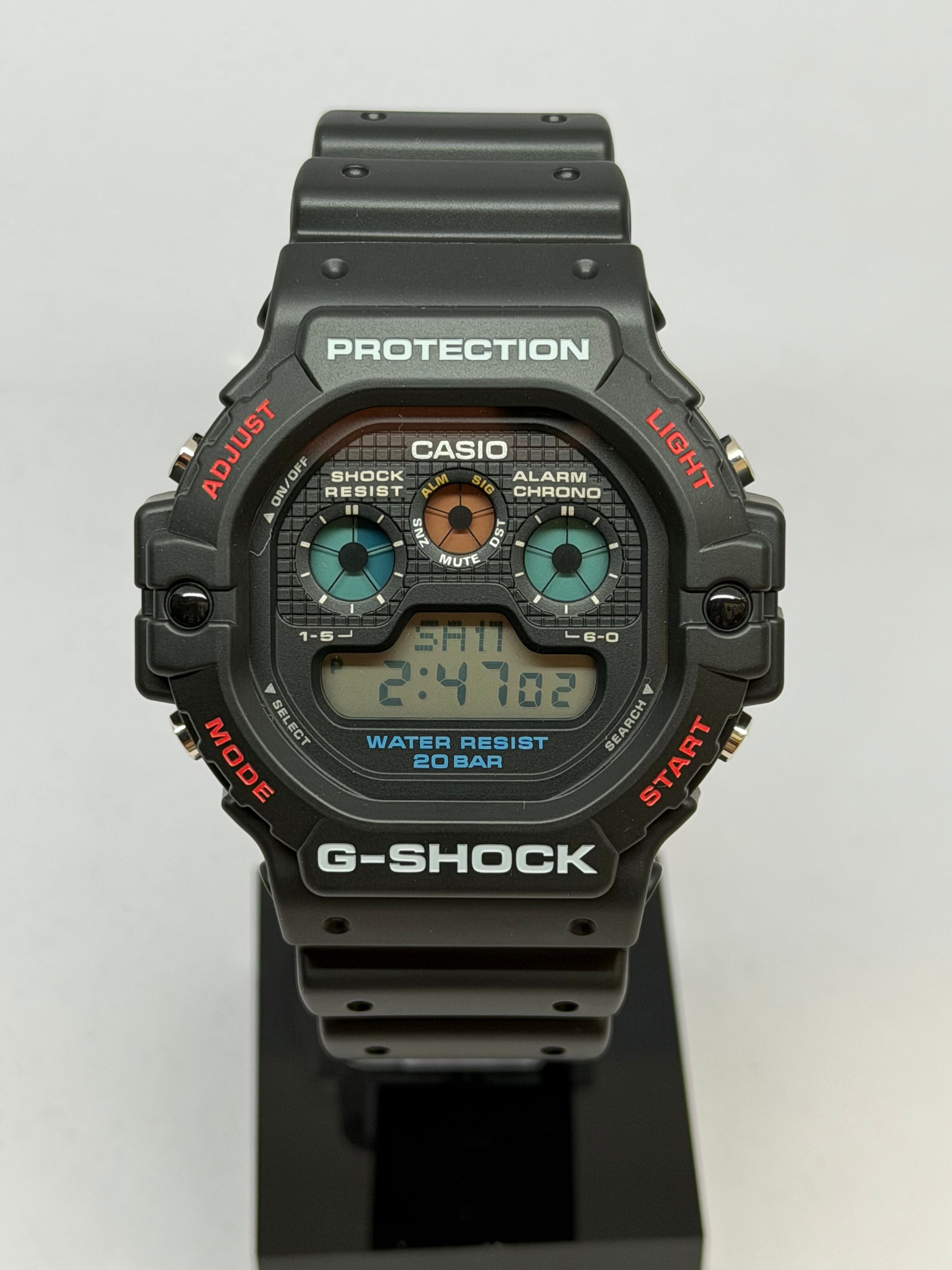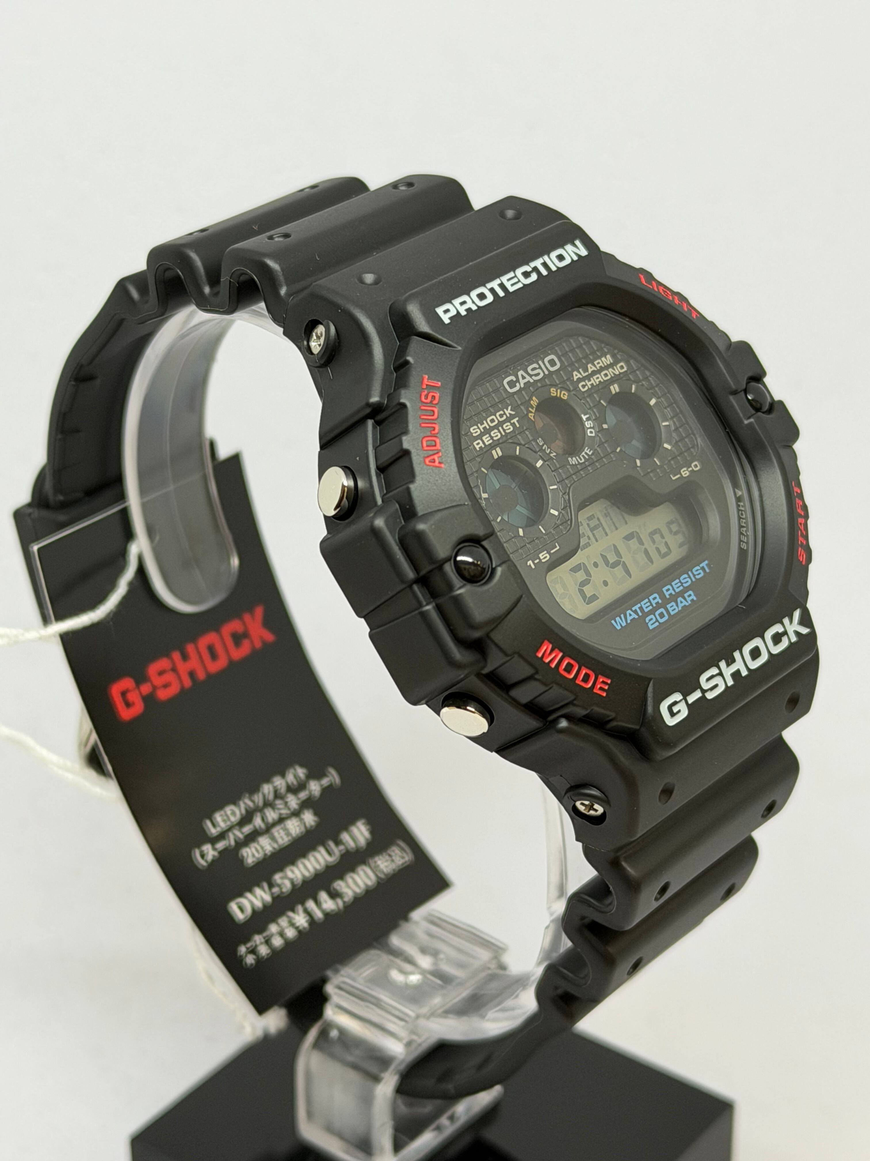 G-SHOCK初期のデジタルベーシックモデルで、斬新な3つのデジタルグラフィックを搭載したDW-5900C。まず海外で発売され世界的に人気を博し、逆輸入で日本でもブレイクしました。このモデルはDW-5900C発売当初のデザインを文字板表記の色に至るまで忠実に再現しています。