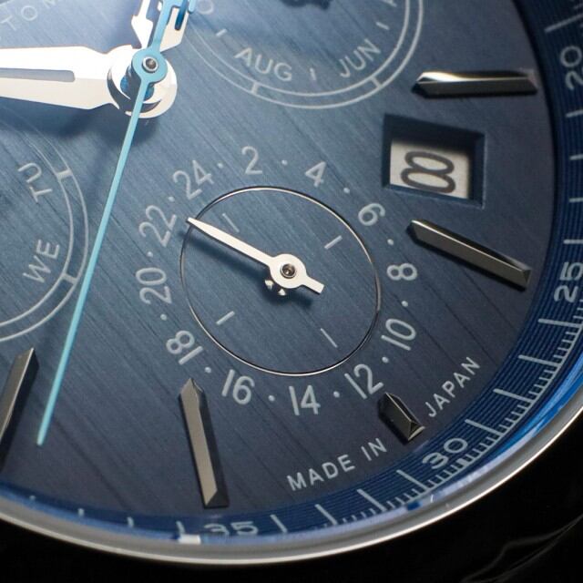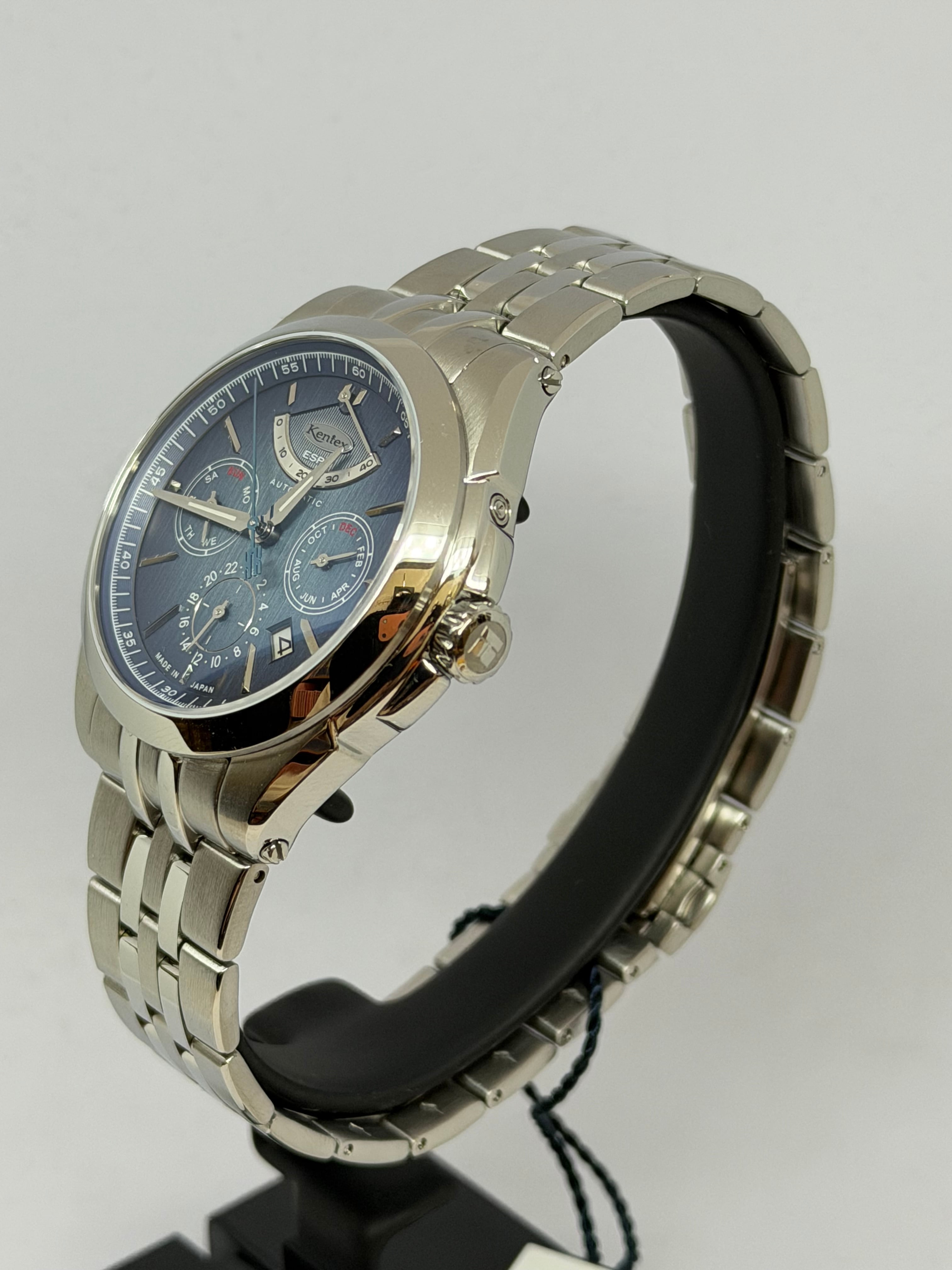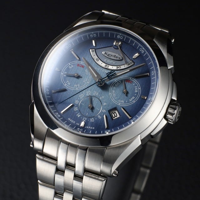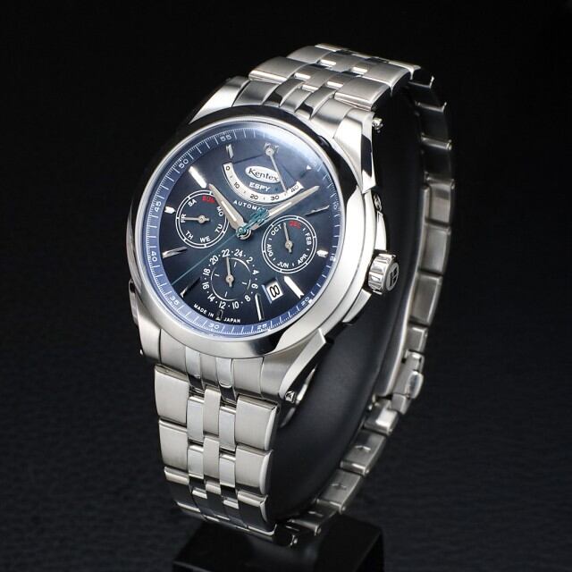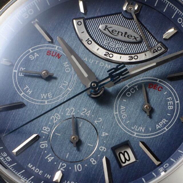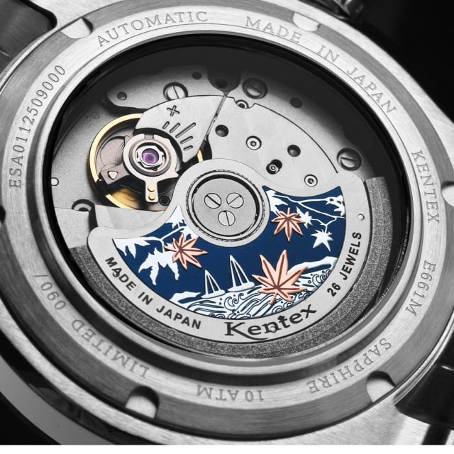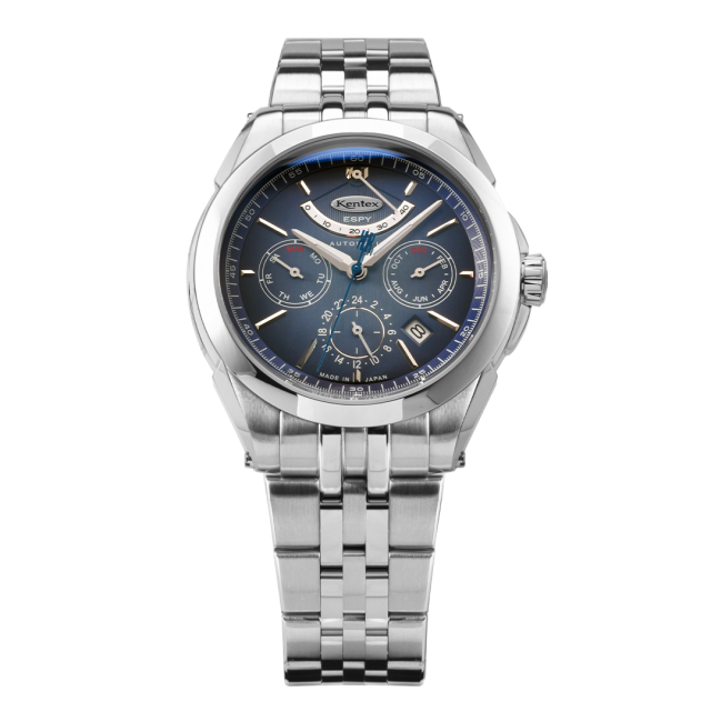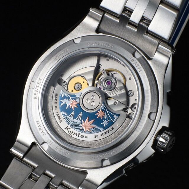 製品名KENTEX エスパイ アクティブⅢ インフィニティブルー[E661M-02]ムーブメントMIYOTA Cal.9100 / 月・日・曜日 / 24時間計 / 42時間パワーリザーブ / 秒針規制 / 28,800振動 / 26石、 日差0~+15秒(自社調整)ケースSUS316Lステンレススチールガラス両面カーブサファイアクリスタル+片面無反射コーティングバンドSUS316L 5連無垢ベルト, 3つ折れ式バックルダイアルグラデーションブルーインデックスダイヤモンドカット バーインデックスリューズプッシュ式リューズ裏蓋スケルトン 紅葉モチーフローター