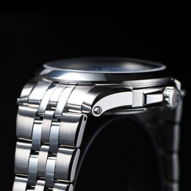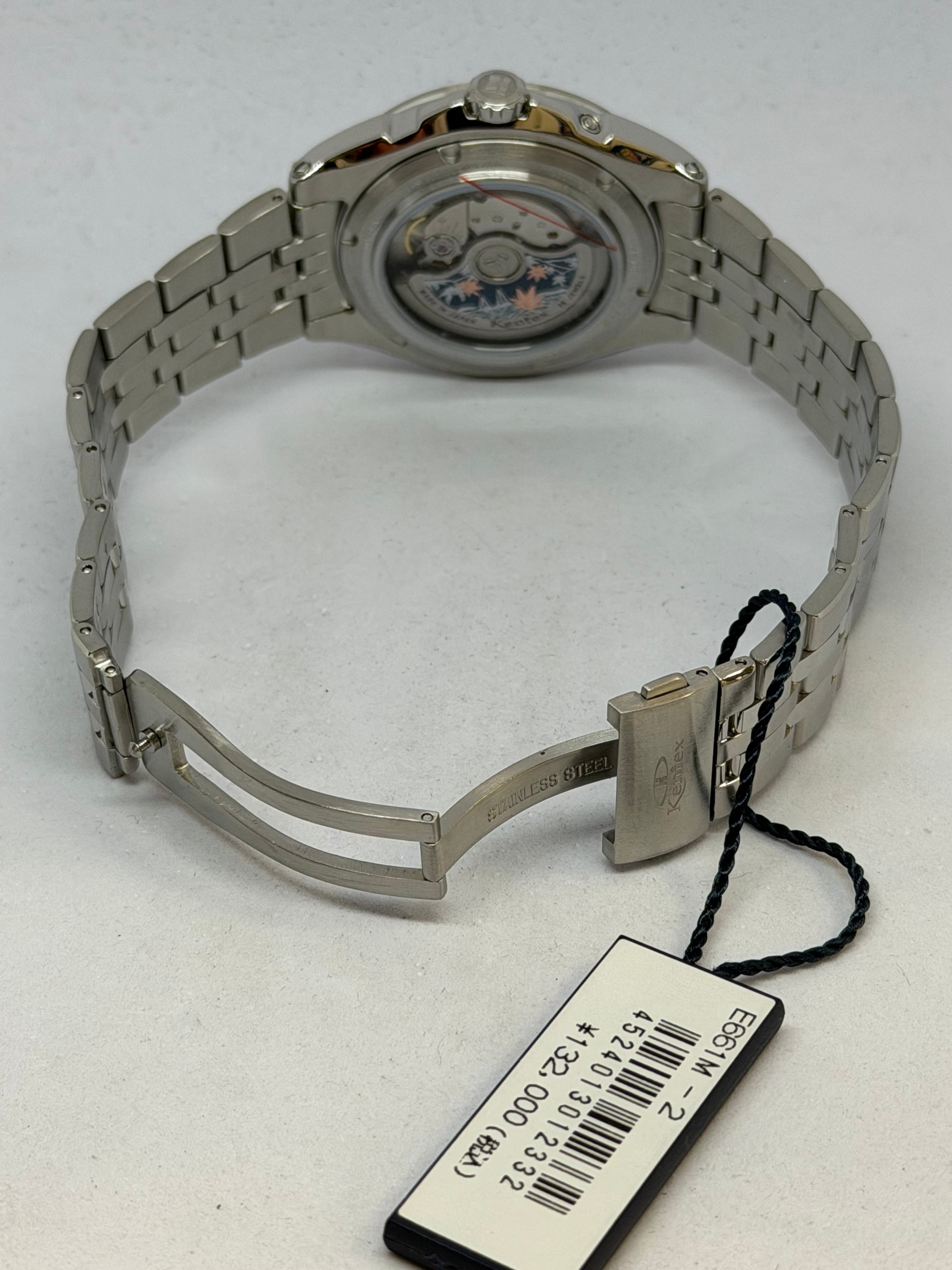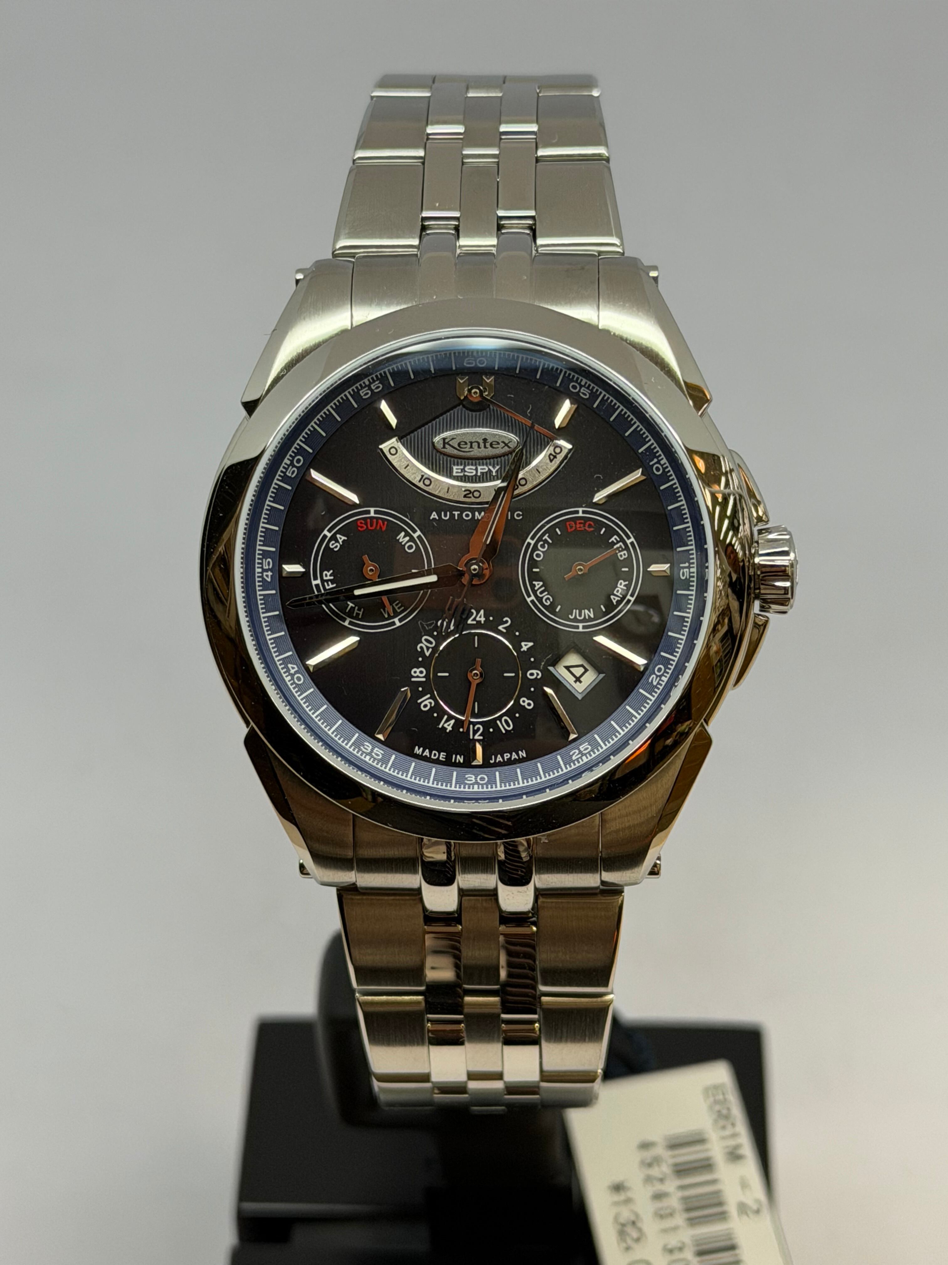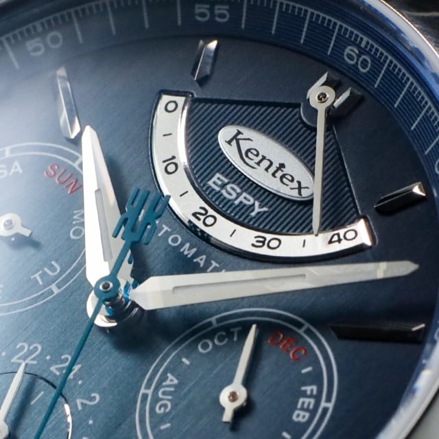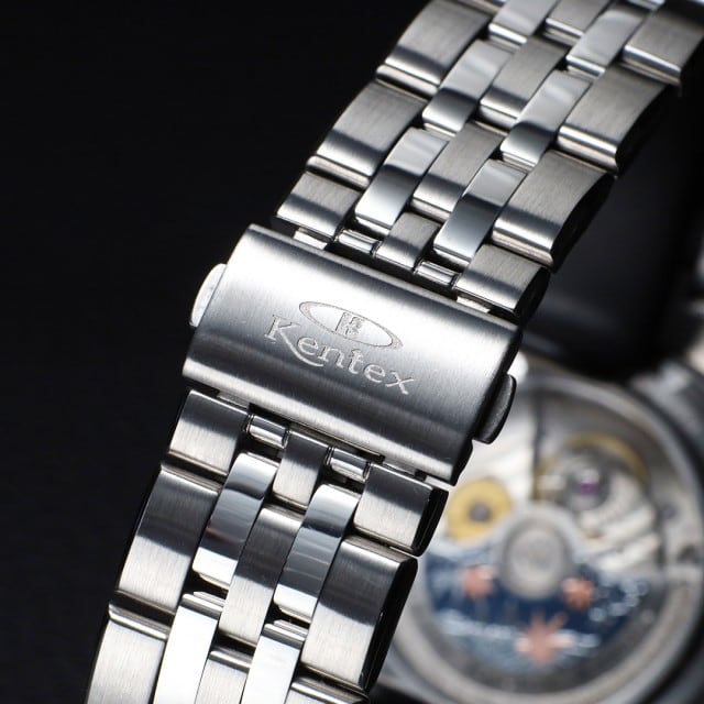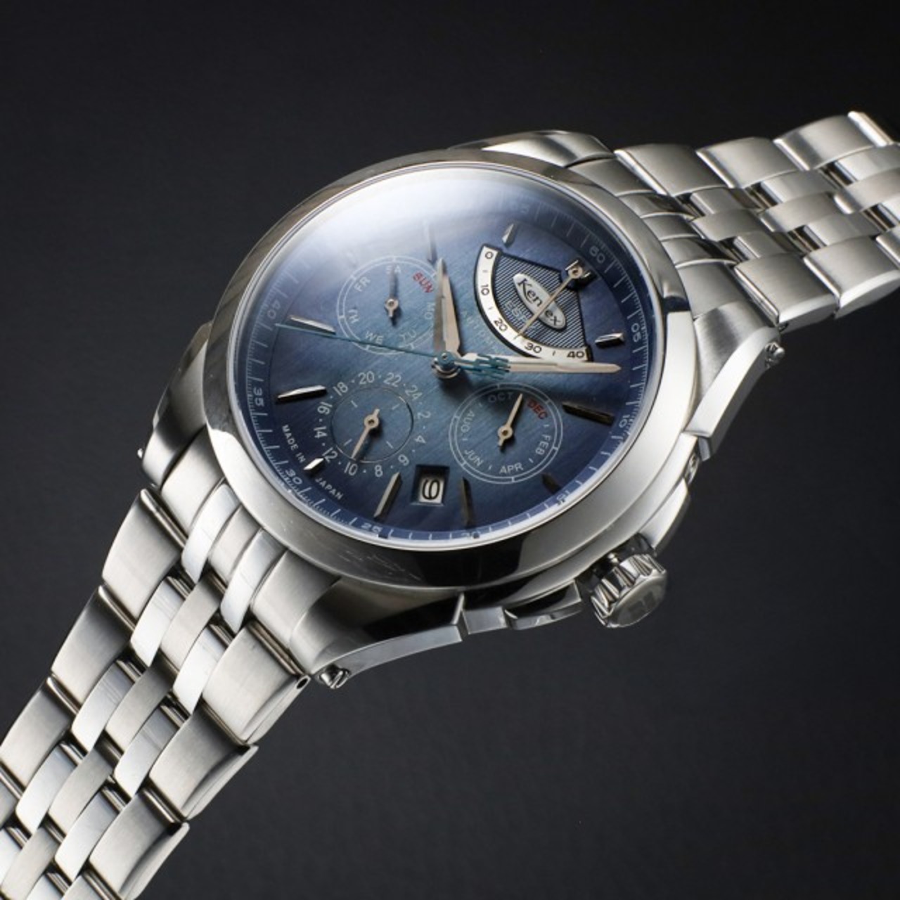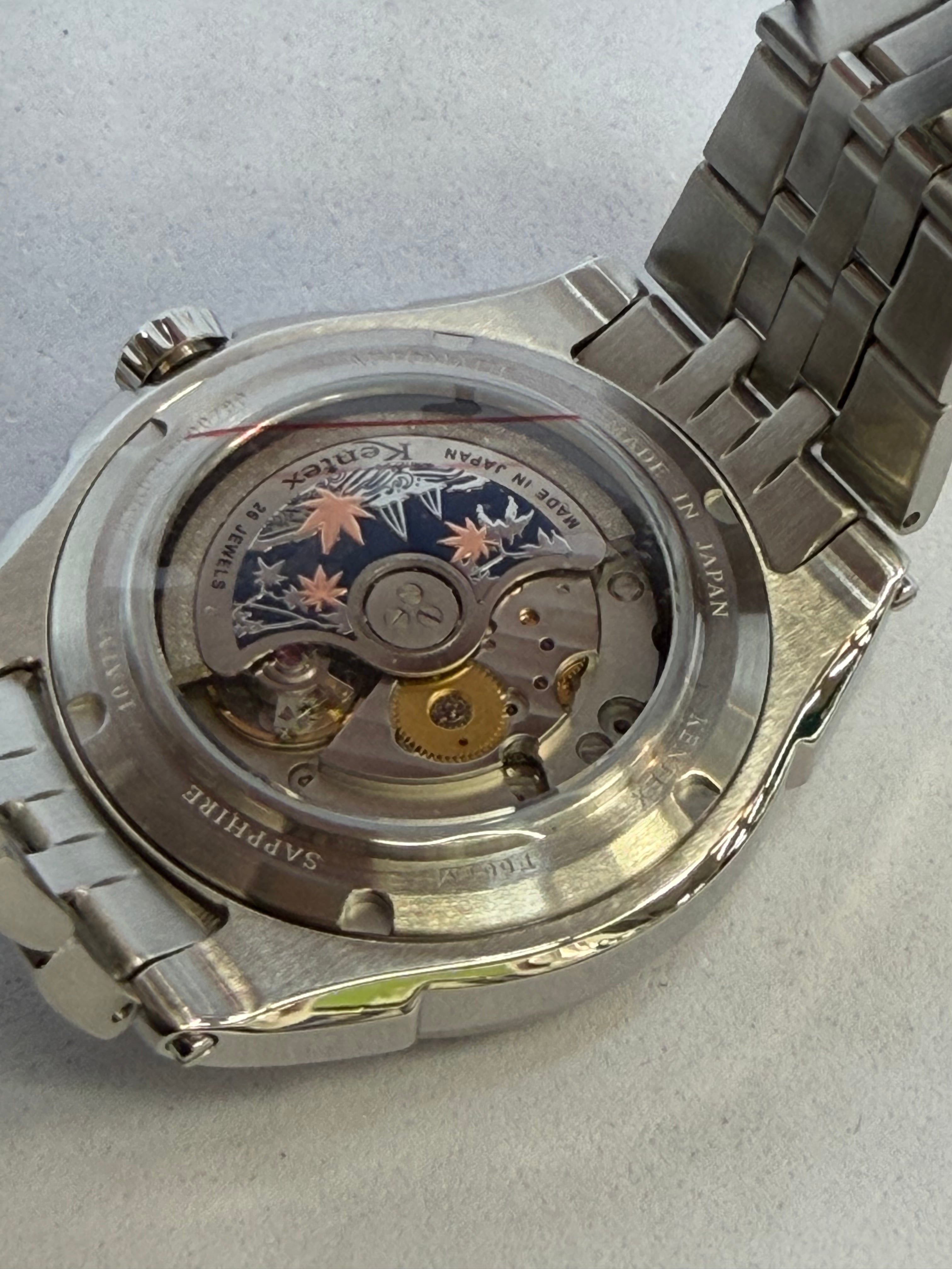 国産ハイビート自動巻きムーブメントを搭載した、ケンテックスのドレススポーツライン「ESPY Active 3」。パワーリザーブ、月・日・曜日表示を備えた本格マルチカレンダーを、洗練されたΦ41mmケースに収めました。両面カーブサファイアガラスとヘアライン文字盤が上質な表情を生み、10気圧防水により実用性も確保。裏スケルトンから覗くローターには、日本の美意識を映した紅葉モチーフをあしらい、機械式時計ならではの鼓動と情緒を静かに語ります。力強さと品格を兼ね備えた、大人のための機械式時計。