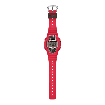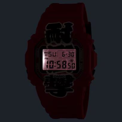 提灯の赤をベースカラーに、ベゼルからバンドまで、G-SHOCKの最たる特徴である「耐衝撃」のプリントを配したユニークなデザイン。バックライトのカラーや持ち手の色味にインスパイアされたボタンと遊環など、こだわりの仕様となっています。裏蓋にも提灯のモチーフを刻印し、パッケージにも赤提灯を大胆にあしらった特別仕様です。