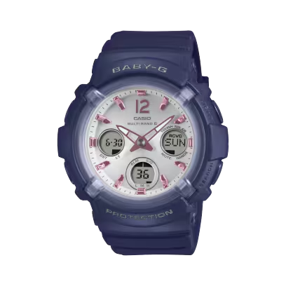 ベーシックな装いにも馴染む電波ソーラーモデルです。ボリューム感のあるフォルムが特徴のBGA-2800シリーズに、ブルーのカラーパレットを採用。ネイビーベースにピンクゴールドの煌めきを差し色に効かせた上品なデザインです。