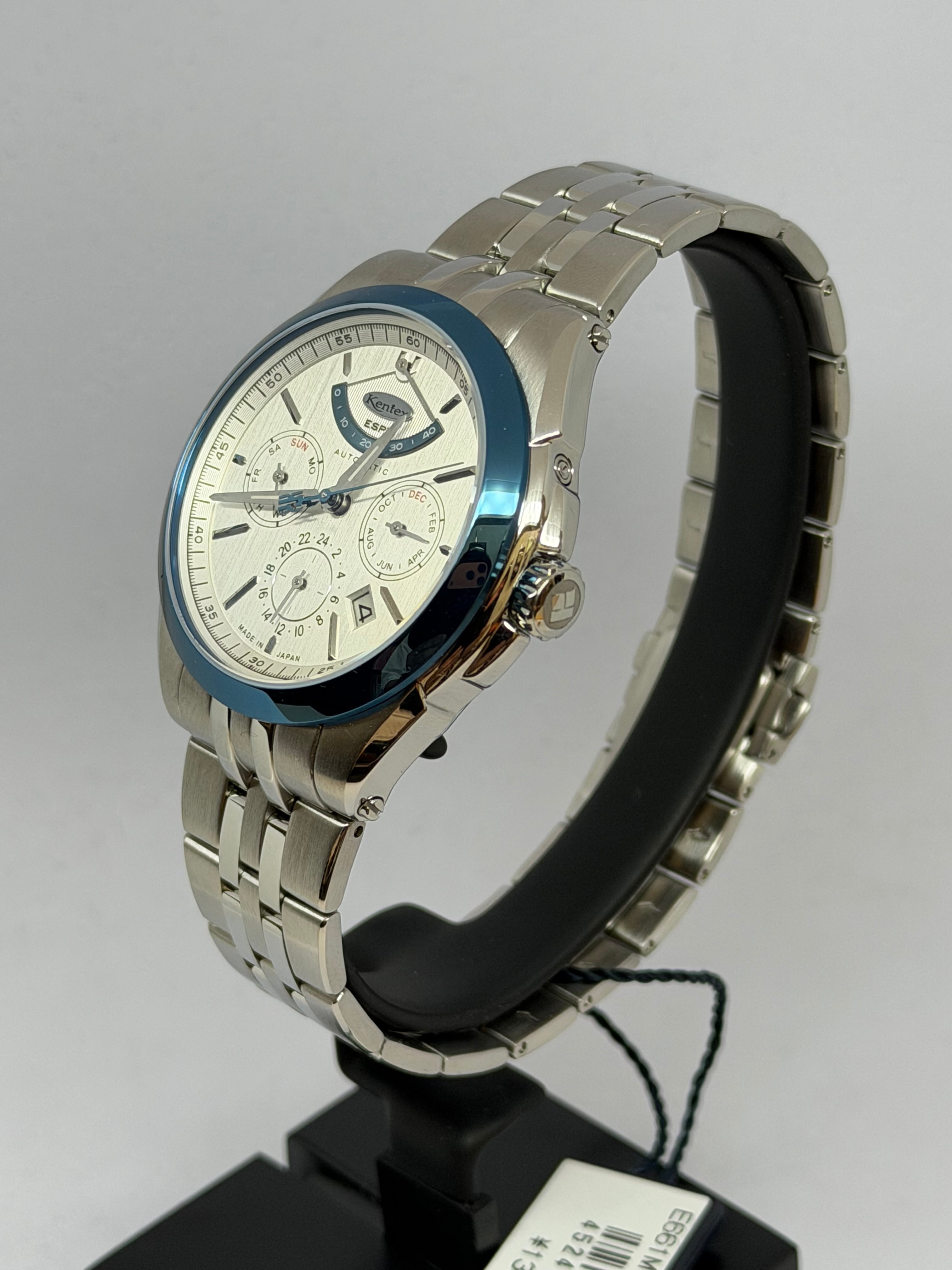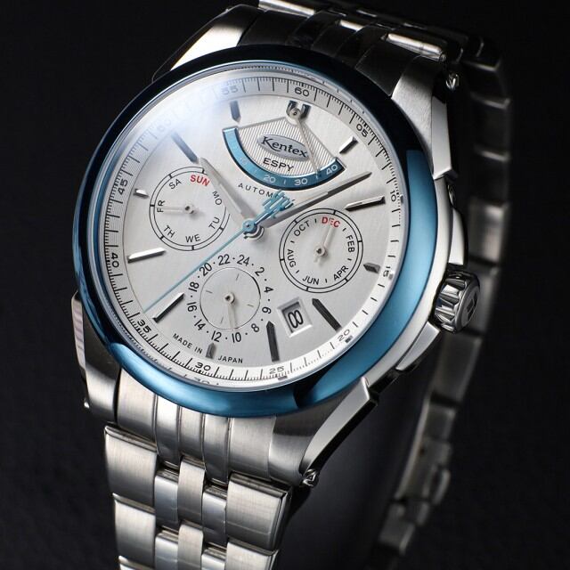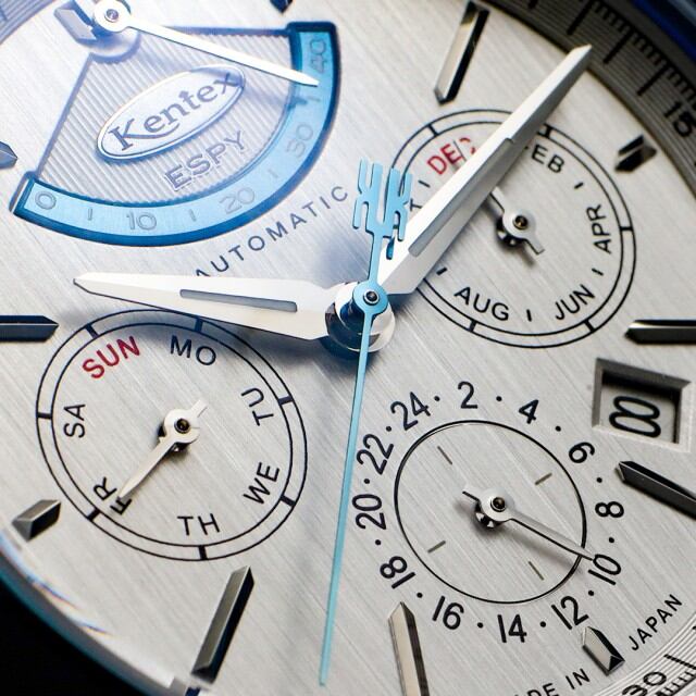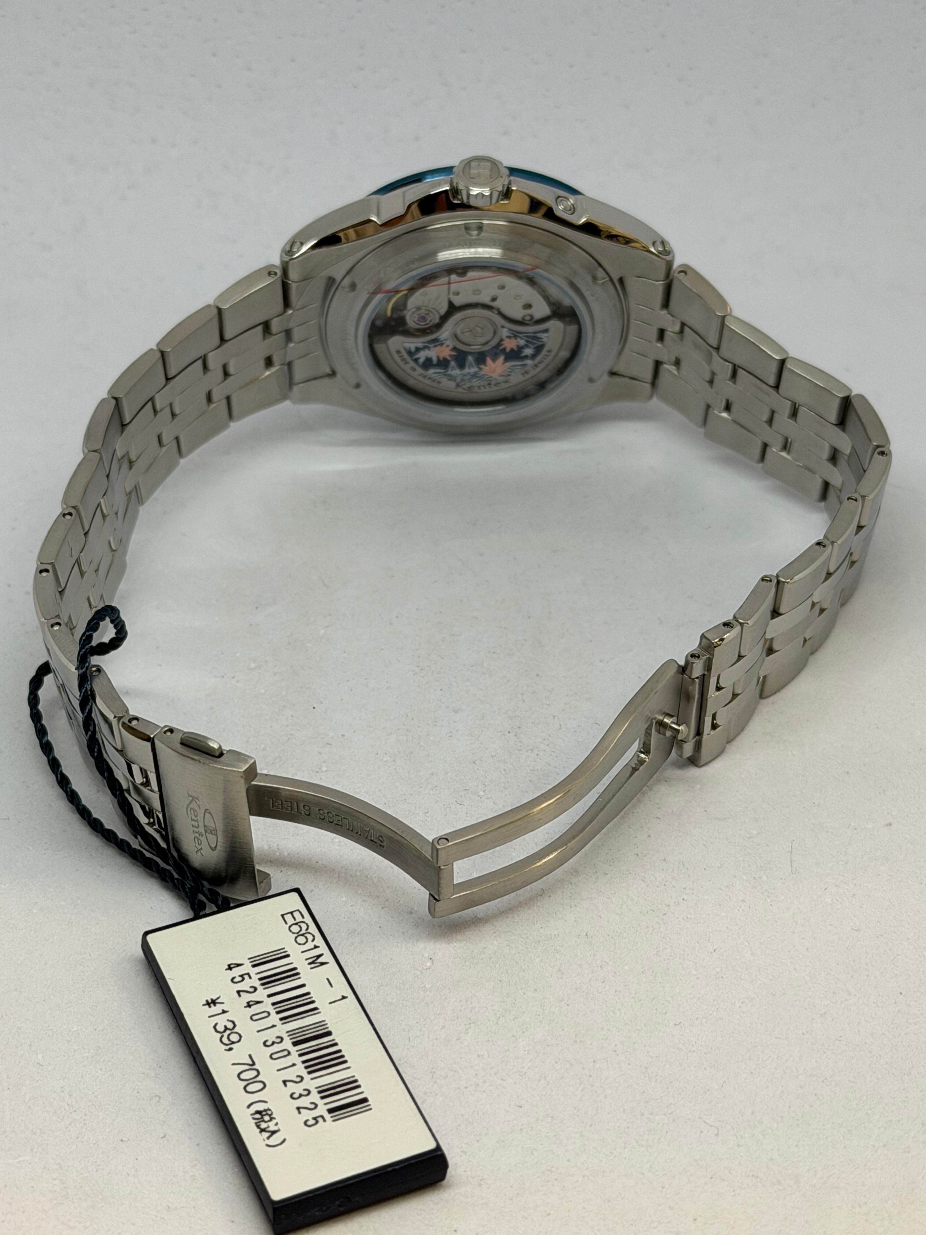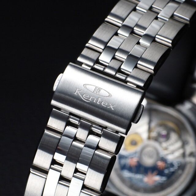 製品名KENTEX エスパイ アクティブⅢ フロストシルバー[E661M-01]ムーブメントMIYOTA Cal.9100 / 月・日・曜日 / 24時間計 / 42時間パワーリザーブ / 秒針規制 / 28,800振動 / 26石、 日差0~+15秒(自社調整)ケースSUS316Lステンレススチールガラス両面カーブサファイアクリスタル+片面無反射コーティングバンドSUS316L 5連無垢ベルト, 3つ折れ式バックルダイアルフロストシルバーインデックスダイヤモンドカット バーインデックスリューズプッシュ式リューズ裏蓋スケルトン 紅葉モチーフローター