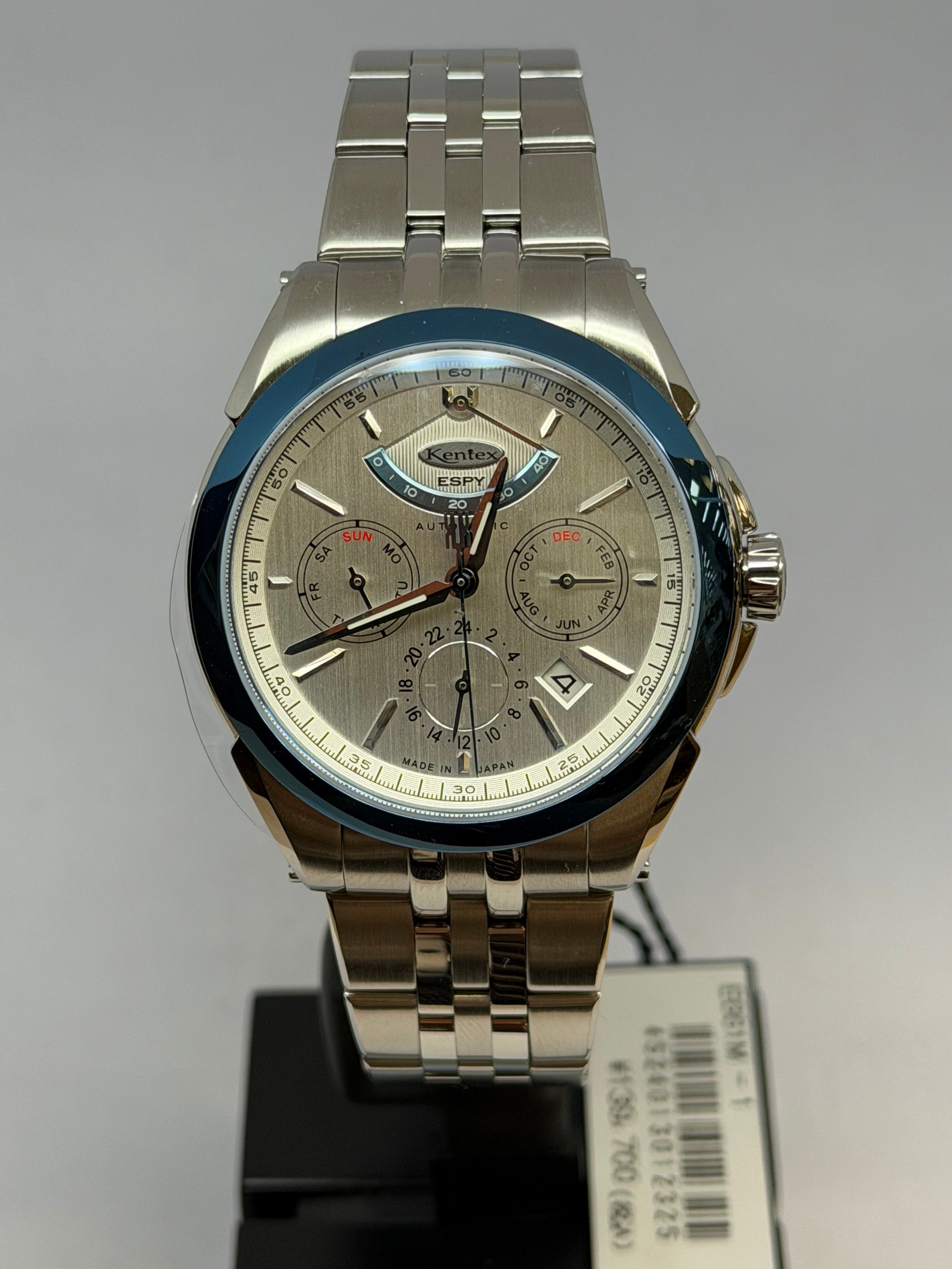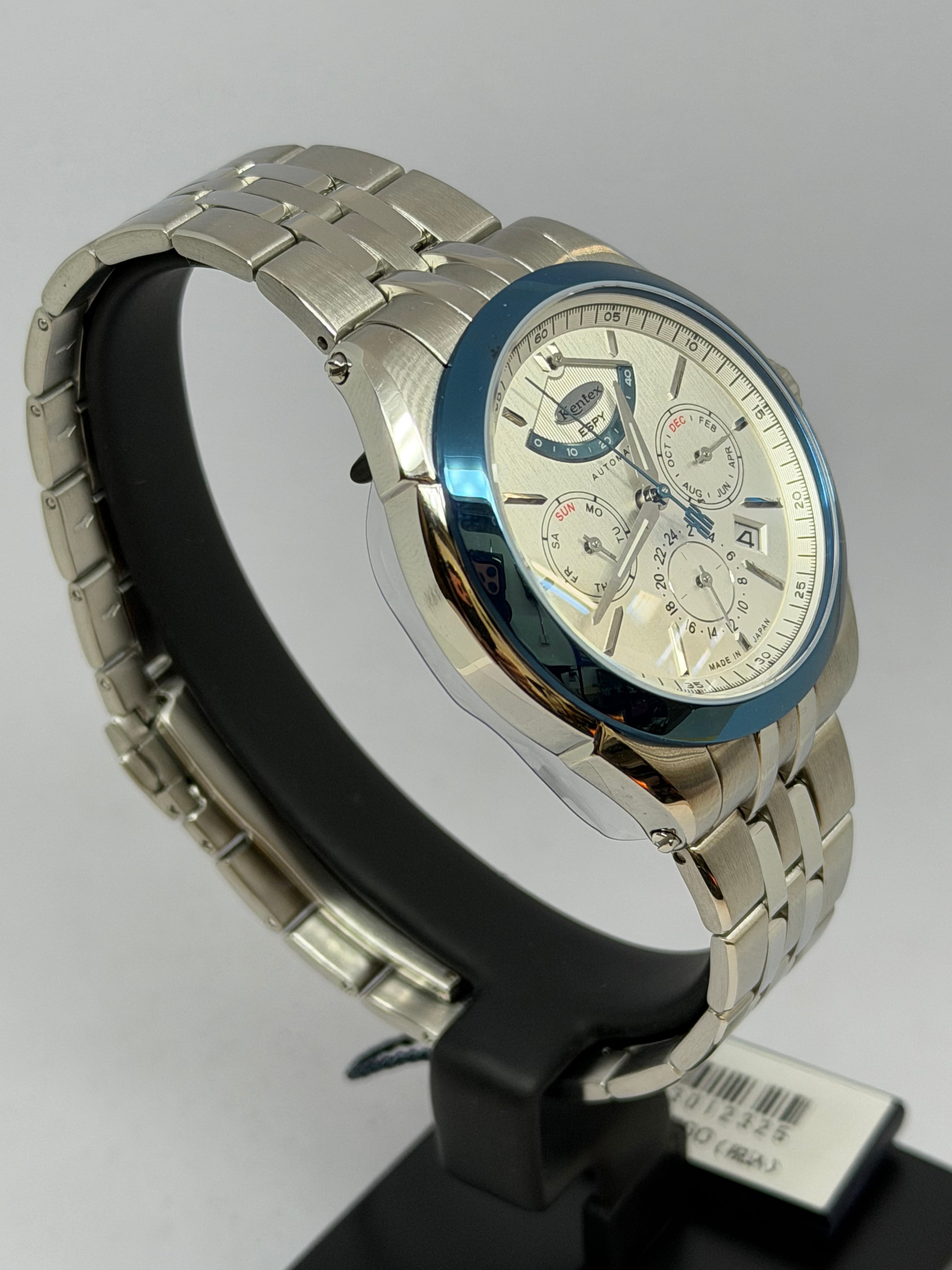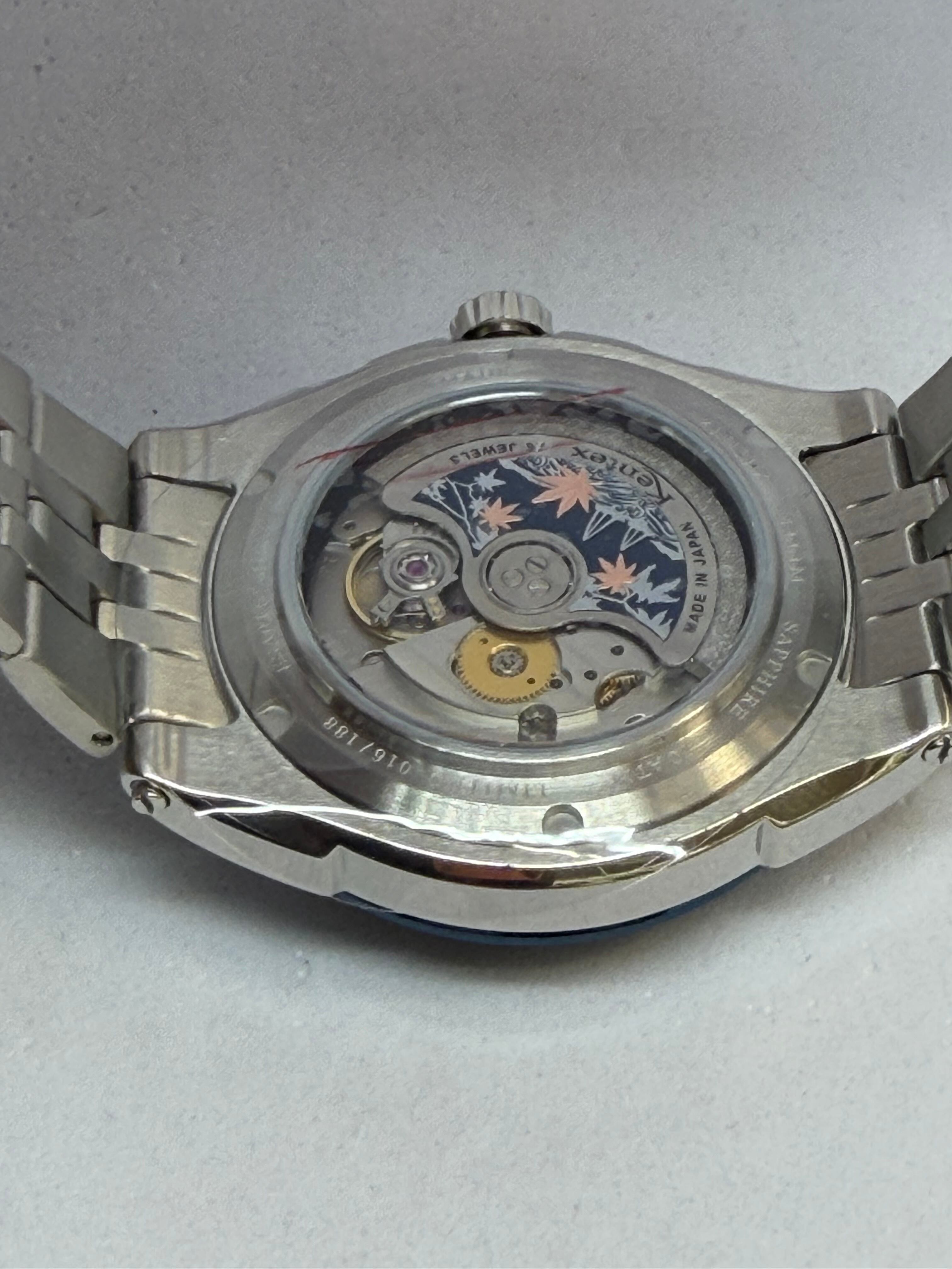 製品名KENTEX エスパイ アクティブⅢ フロストシルバー[E661M-01]ムーブメントMIYOTA Cal.9100 / 月・日・曜日 / 24時間計 / 42時間パワーリザーブ / 秒針規制 / 28,800振動 / 26石、 日差0~+15秒(自社調整)ケースSUS316Lステンレススチールガラス両面カーブサファイアクリスタル+片面無反射コーティングバンドSUS316L 5連無垢ベルト, 3つ折れ式バックルダイアルフロストシルバーインデックスダイヤモンドカット バーインデックスリューズプッシュ式リューズ裏蓋スケルトン 紅葉モチーフローター