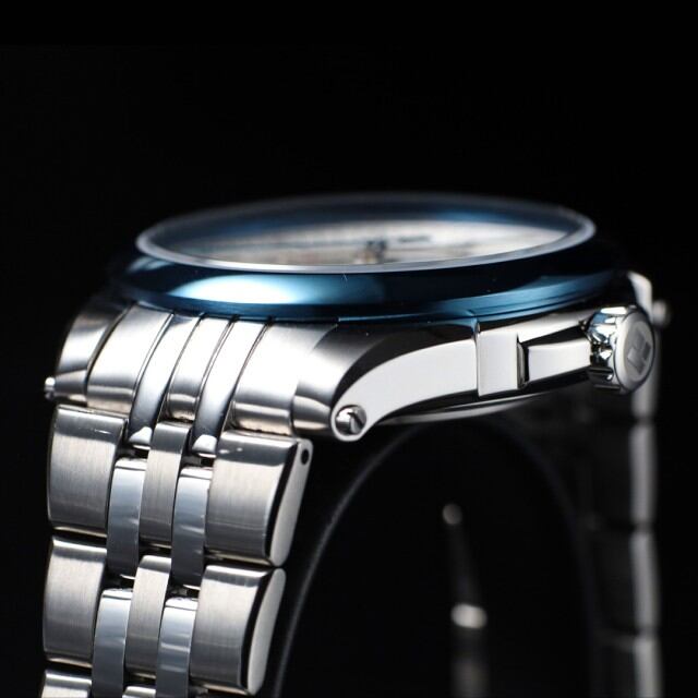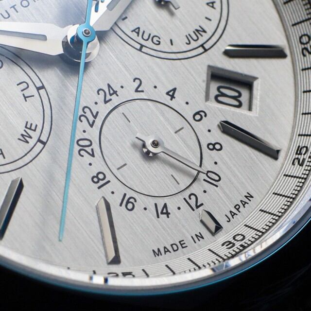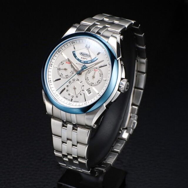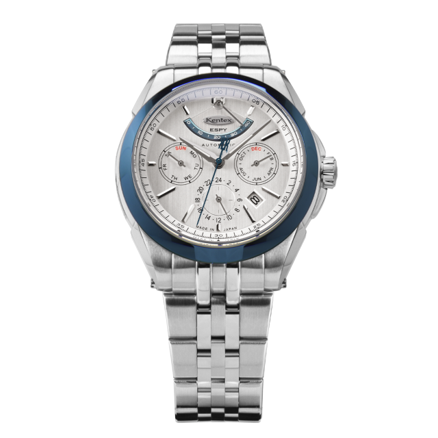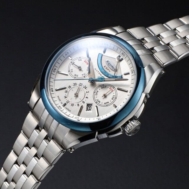 国産ハイビート自動巻きムーブメントを搭載した、ケンテックスのドレススポーツライン「ESPY Active 3」。パワーリザーブ、月・日・曜日表示を備えた本格マルチカレンダーを、洗練されたΦ41mmケースに収めました。両面カーブサファイアガラスとヘアライン文字盤が上質な表情を生み、10気圧防水により実用性も確保。裏スケルトンから覗くローターには、日本の美意識を映した紅葉モチーフをあしらい、機械式時計ならではの鼓動と情緒を静かに語ります。力強さと品格を兼ね備えた、大人のための機械式時計。