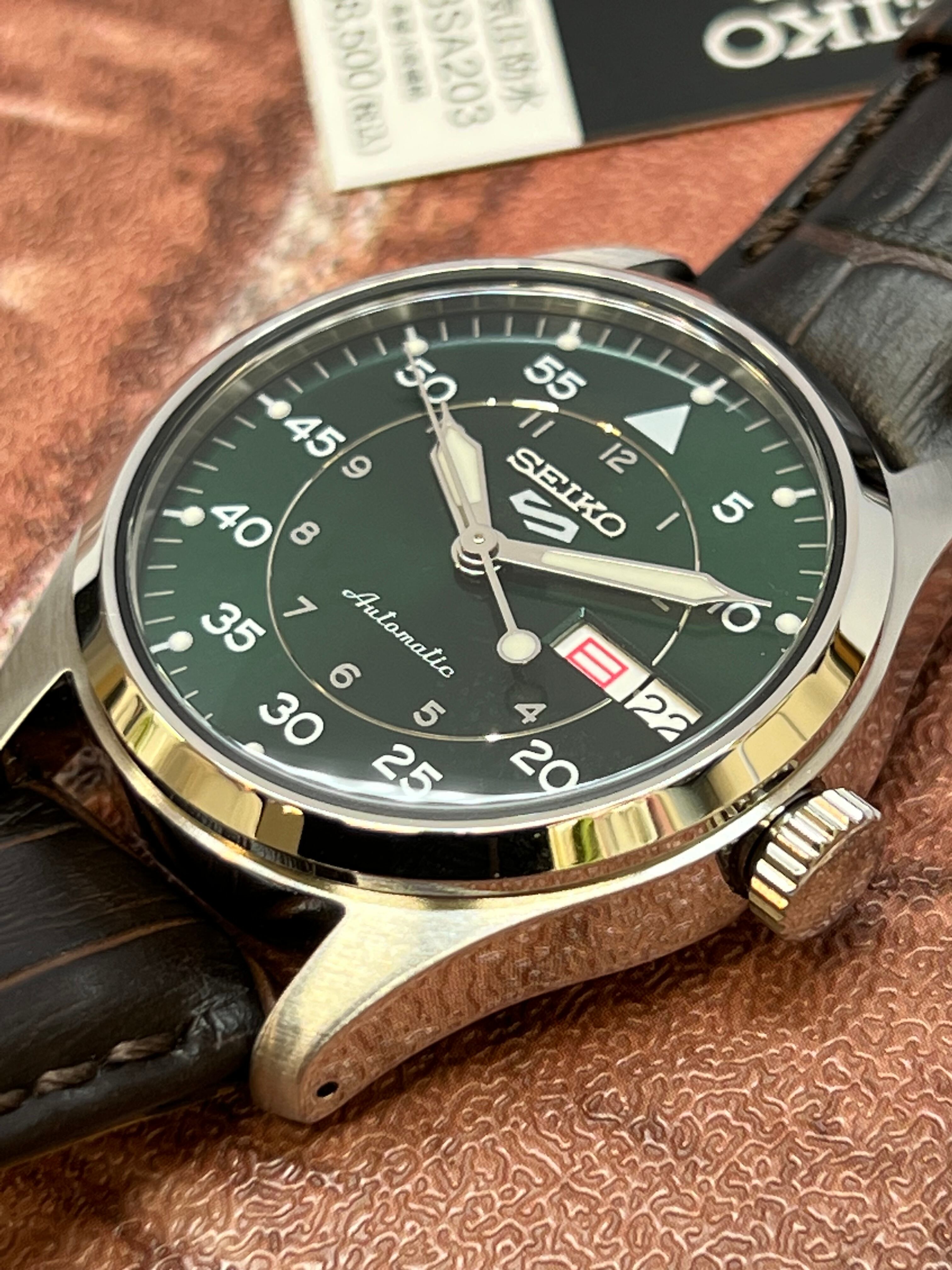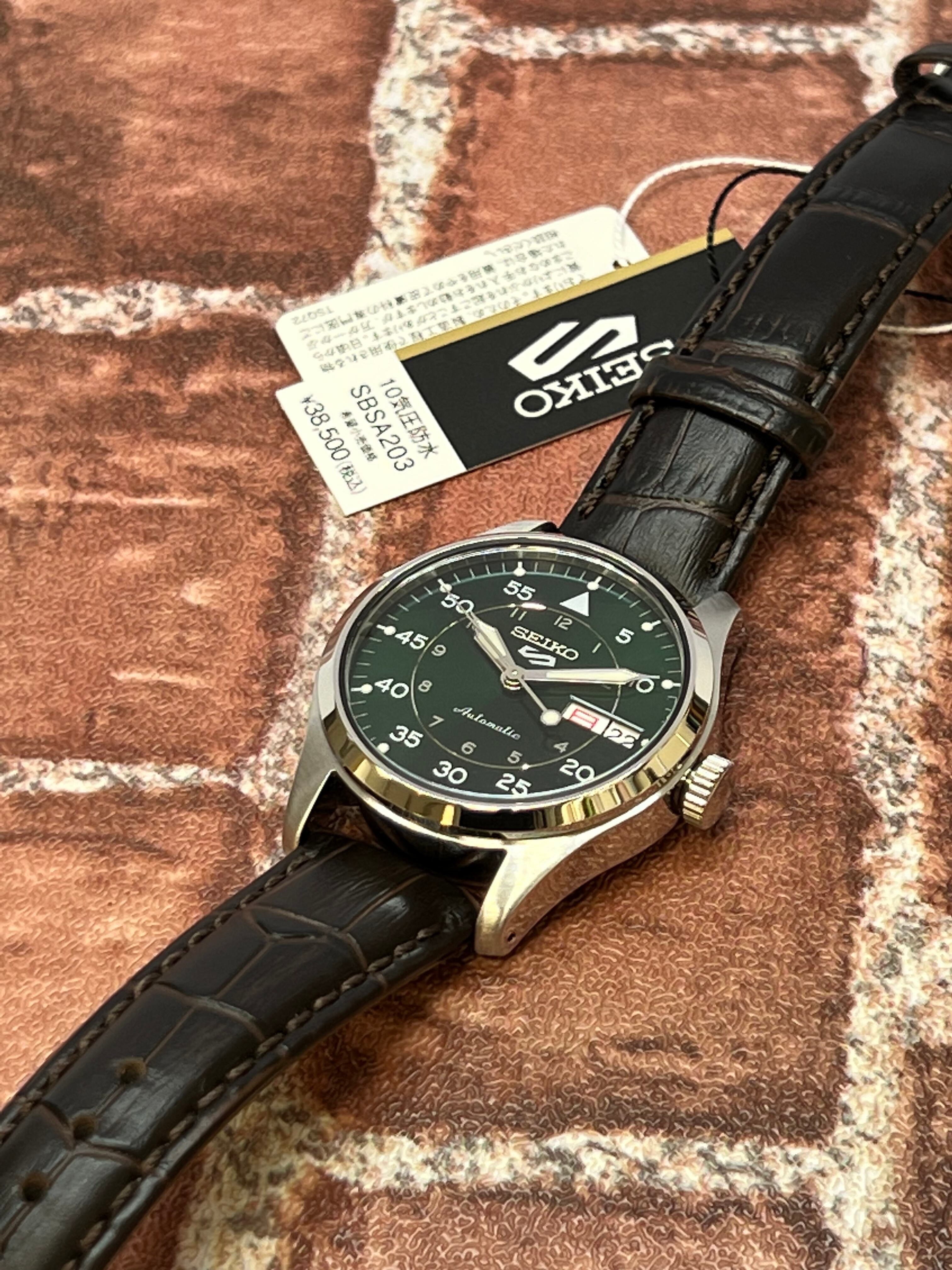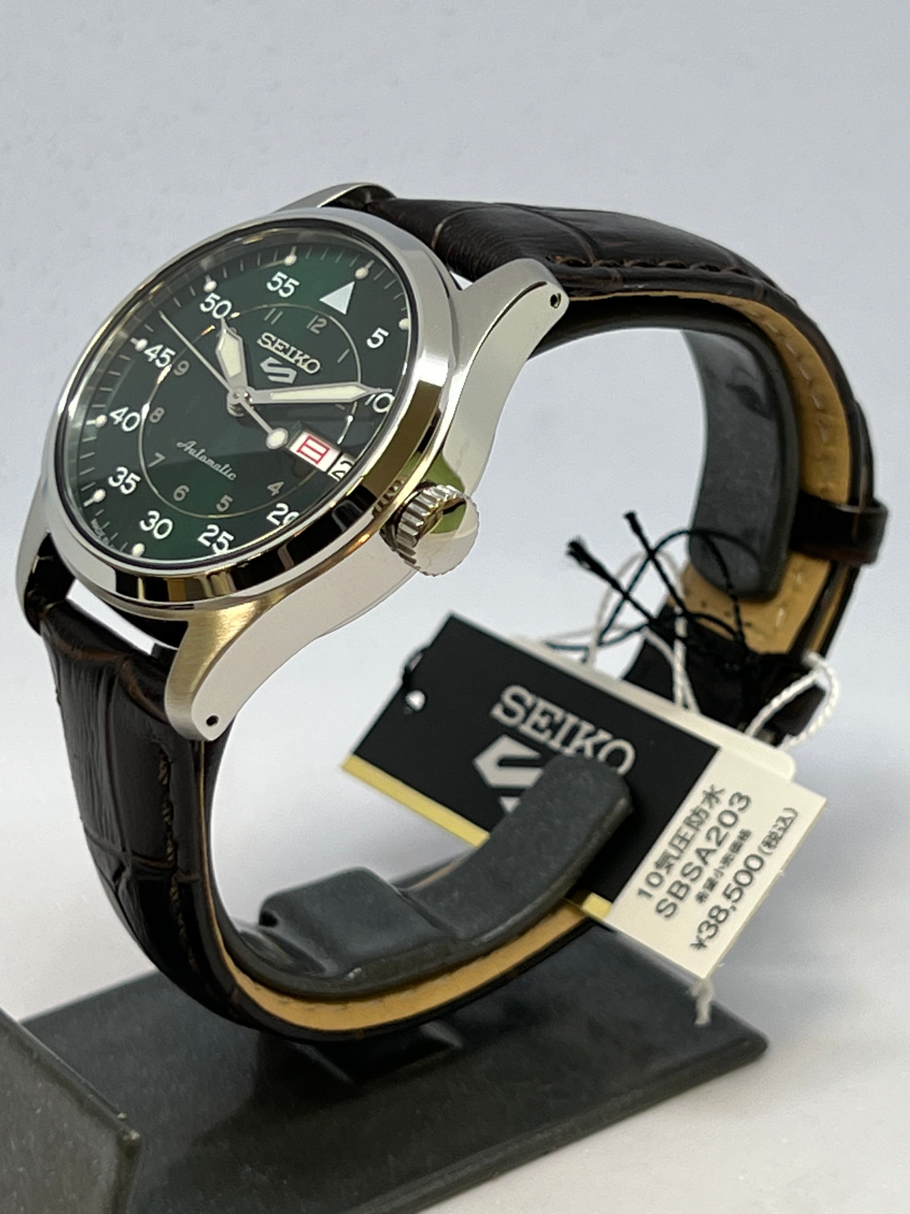 5スポーツになって若々しいスタイルになって登場です!牛革型押しのバンドと文字盤の鮮やかなグリーンがスーツスタイルに似合います(^_-)-☆