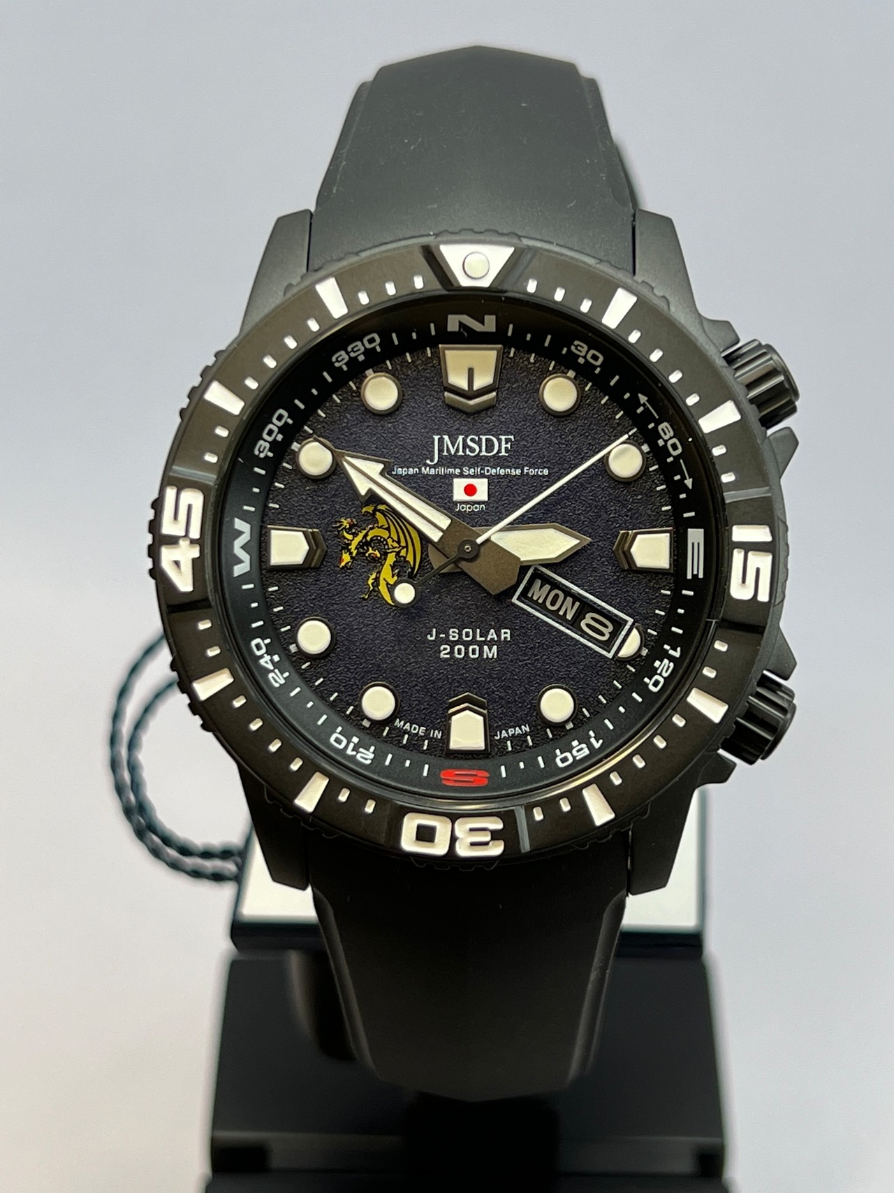 航海では曜日感覚がなくなるという隊員の声を反映し、デイデイト(曜日・日付)カレンダー機能を搭載。方位計の目盛りは回転式インナーベゼル!200m防水のダイバーズウォッチです。