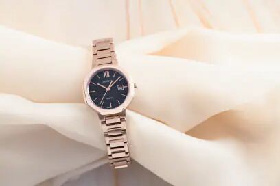 フェイスはシンプルな丸ダイアルに八角形のケースを合わせることで、シャープでエレガントな印象に仕上げました。ベゼル・バンドの天面はヘアラインで仕上げ、ベゼルケース側面はミラー仕上げにすることで質感を高めています。