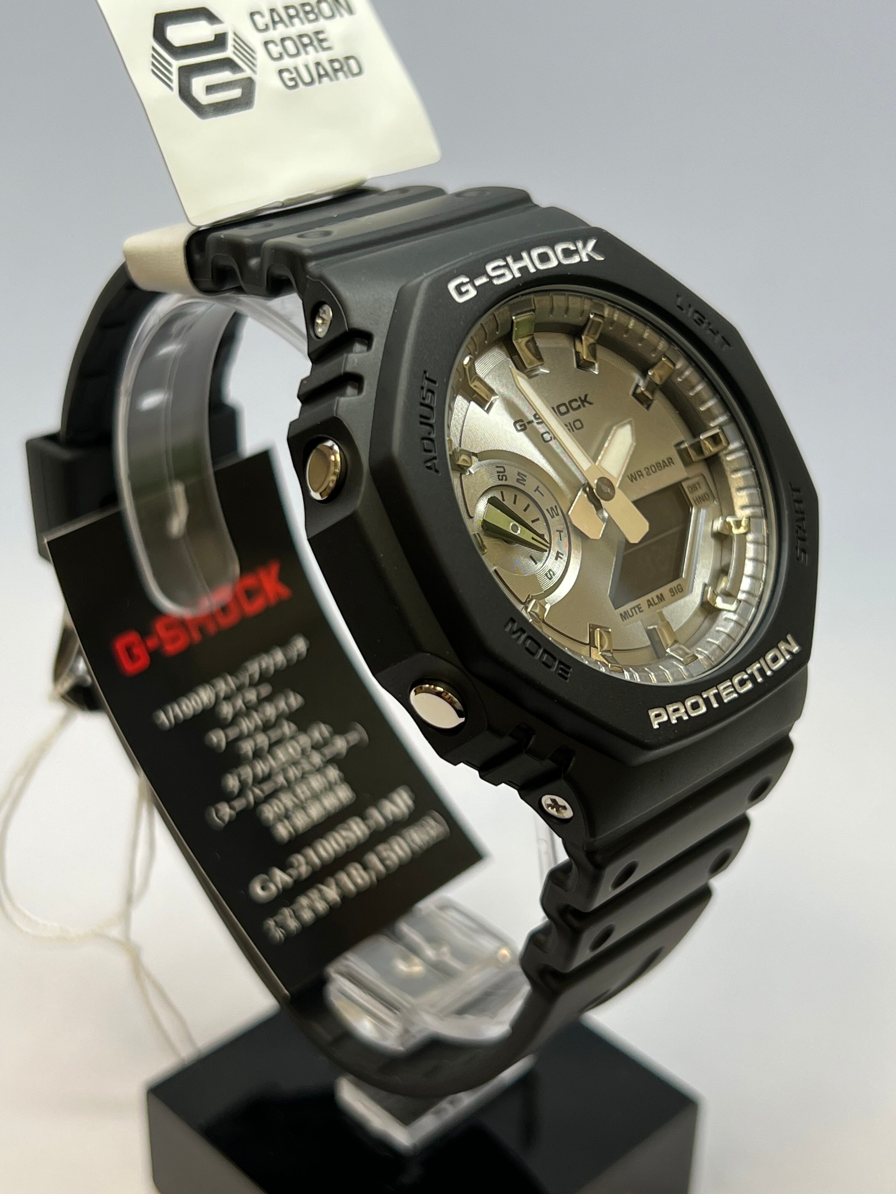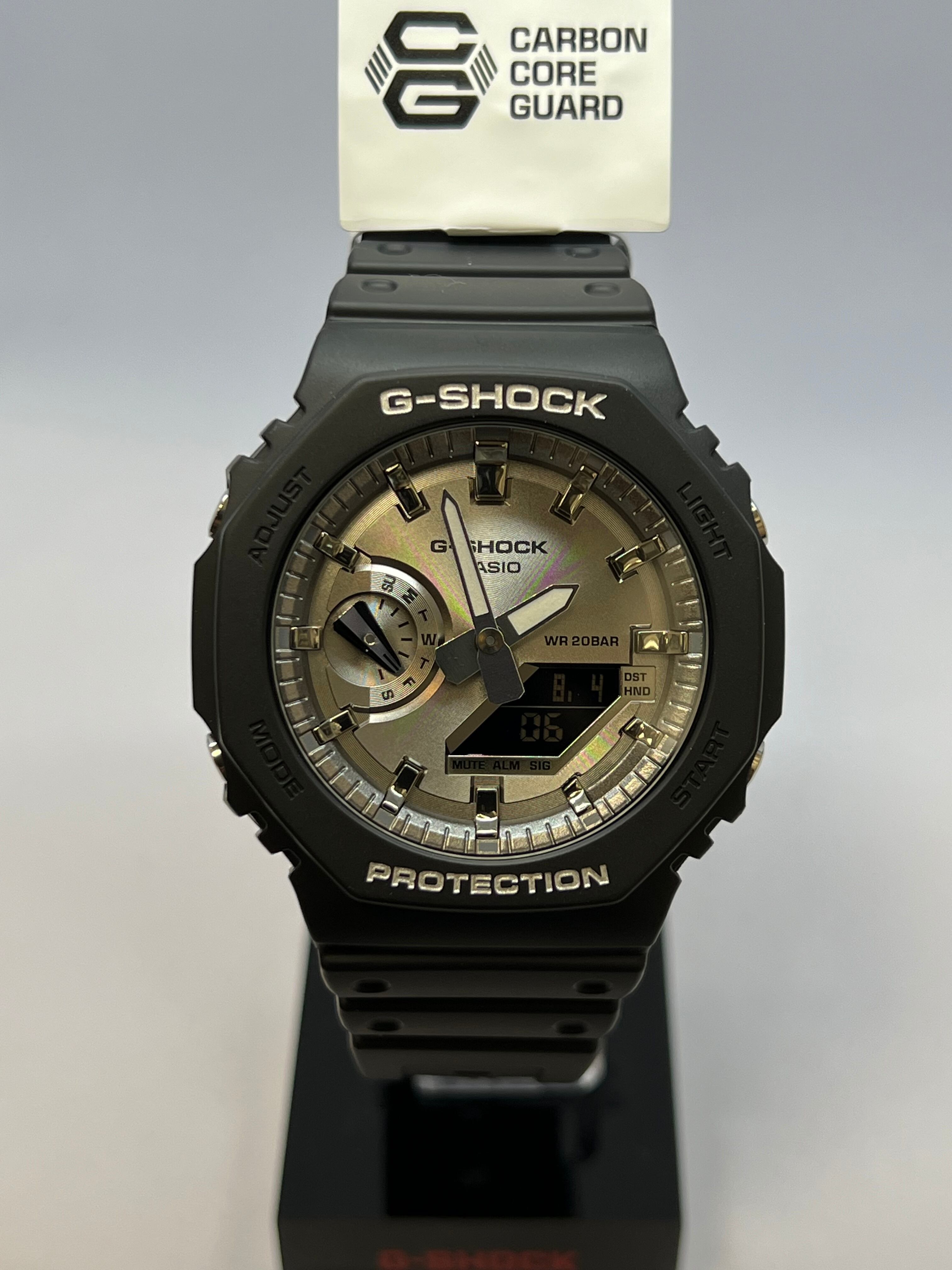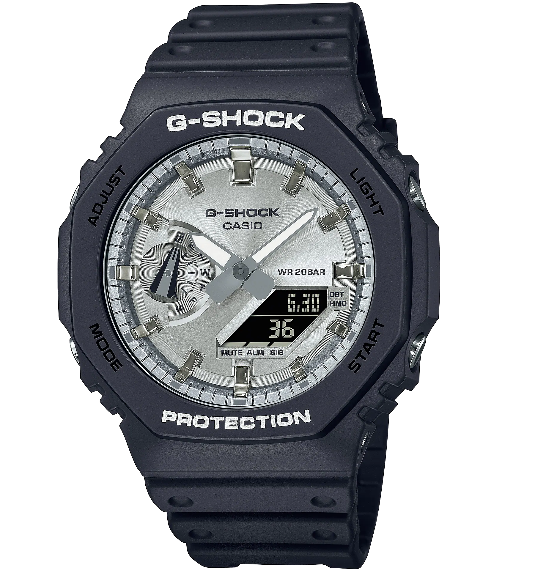 初代モデル“DW-5000C”にも採用された“八角形フォルム”を継承したGA-2100は、タフな構造をそのままに薄型化を果たしたデジタル・アナログコンビネーションモデルです。