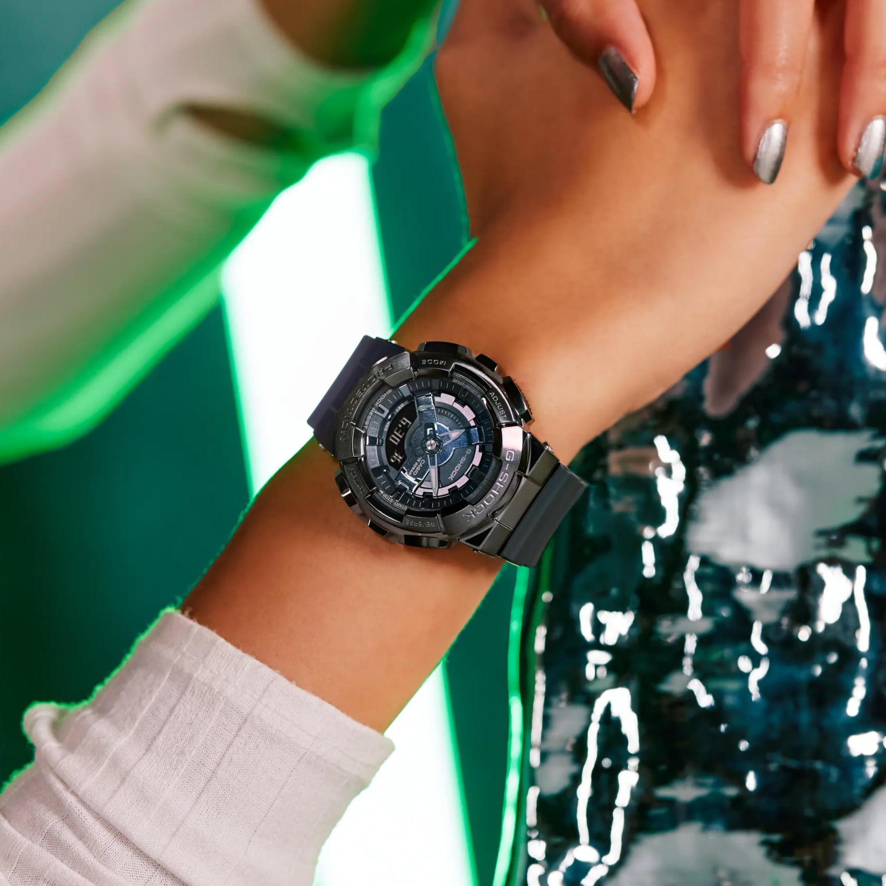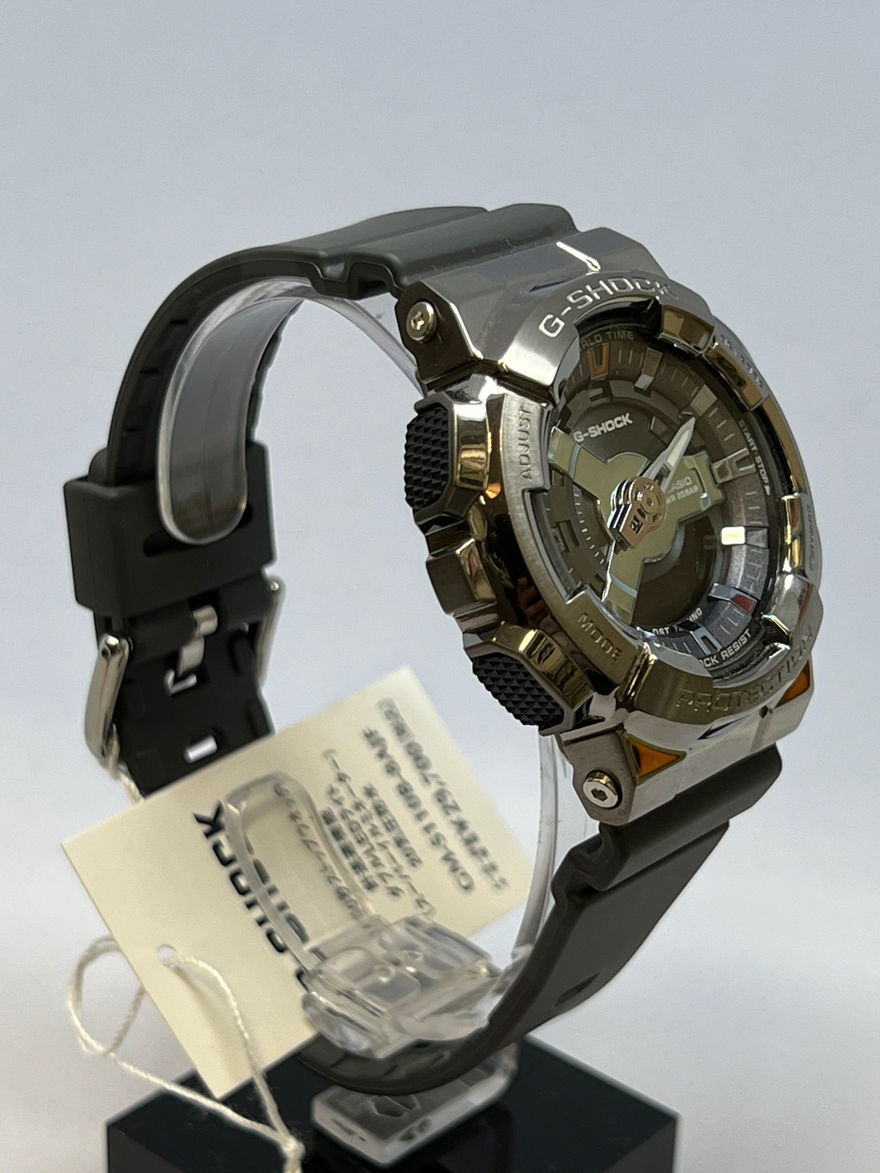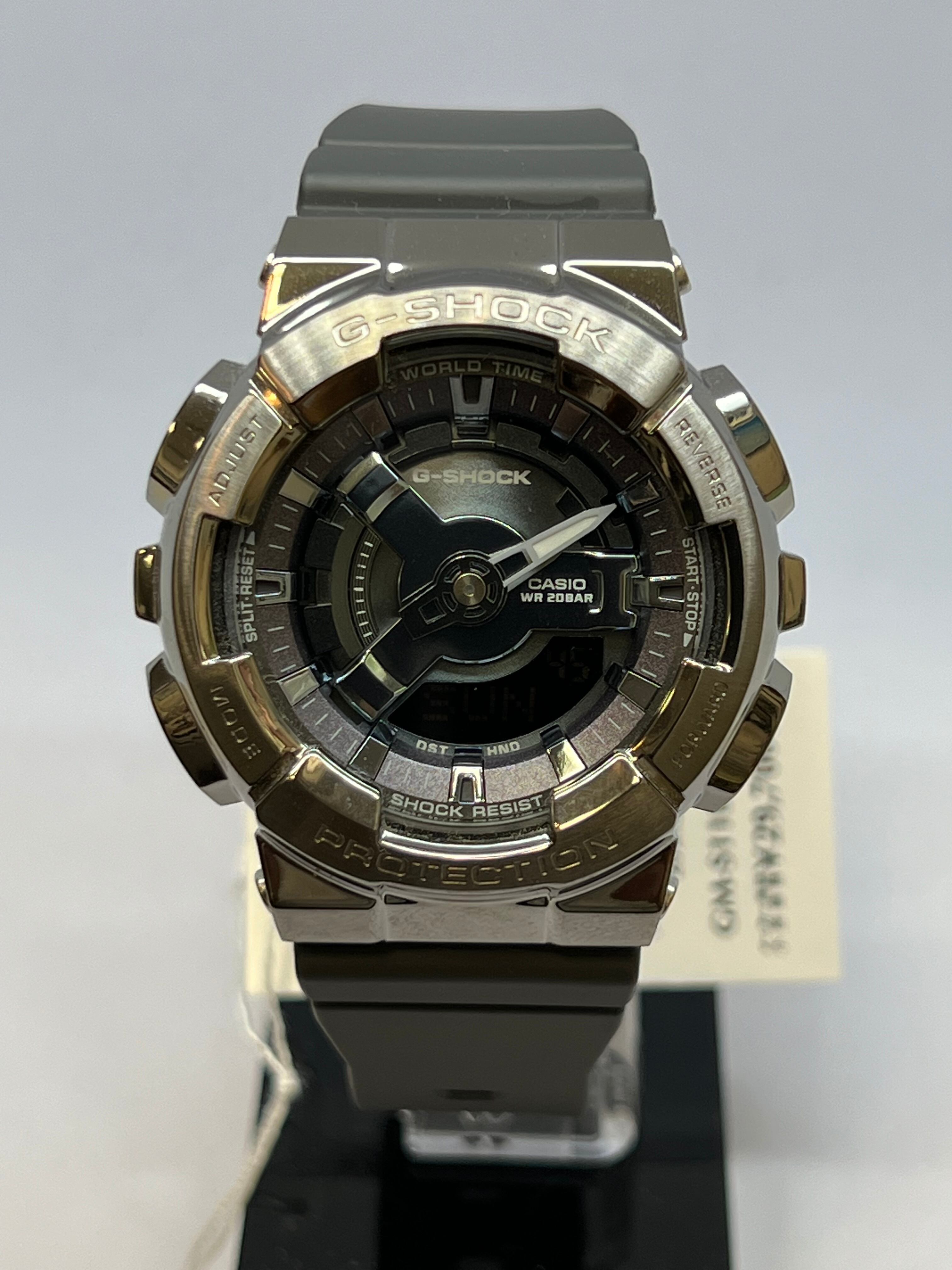 細かなパーツが積み重なった立体的な文字板デザインに、デジタル表示と時針・分針がバランスよく配置され見やすいデザインです。