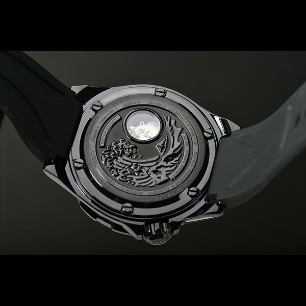ベゼル表面には、傷がつかないサファイアパネルを使用しており半永久的に傷から守り、裏蓋には『冨岳三十六景』をモチーフに「波富士」を高級感ある型打ち加工で表現し、また小窓から機械のテンプが眺められるパーシャルスケルトン仕様になっております。