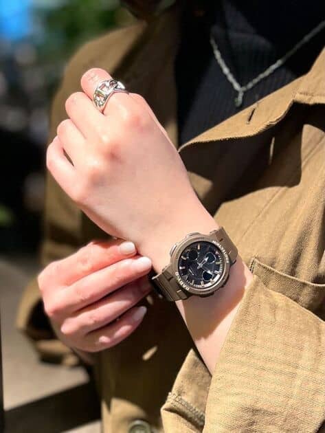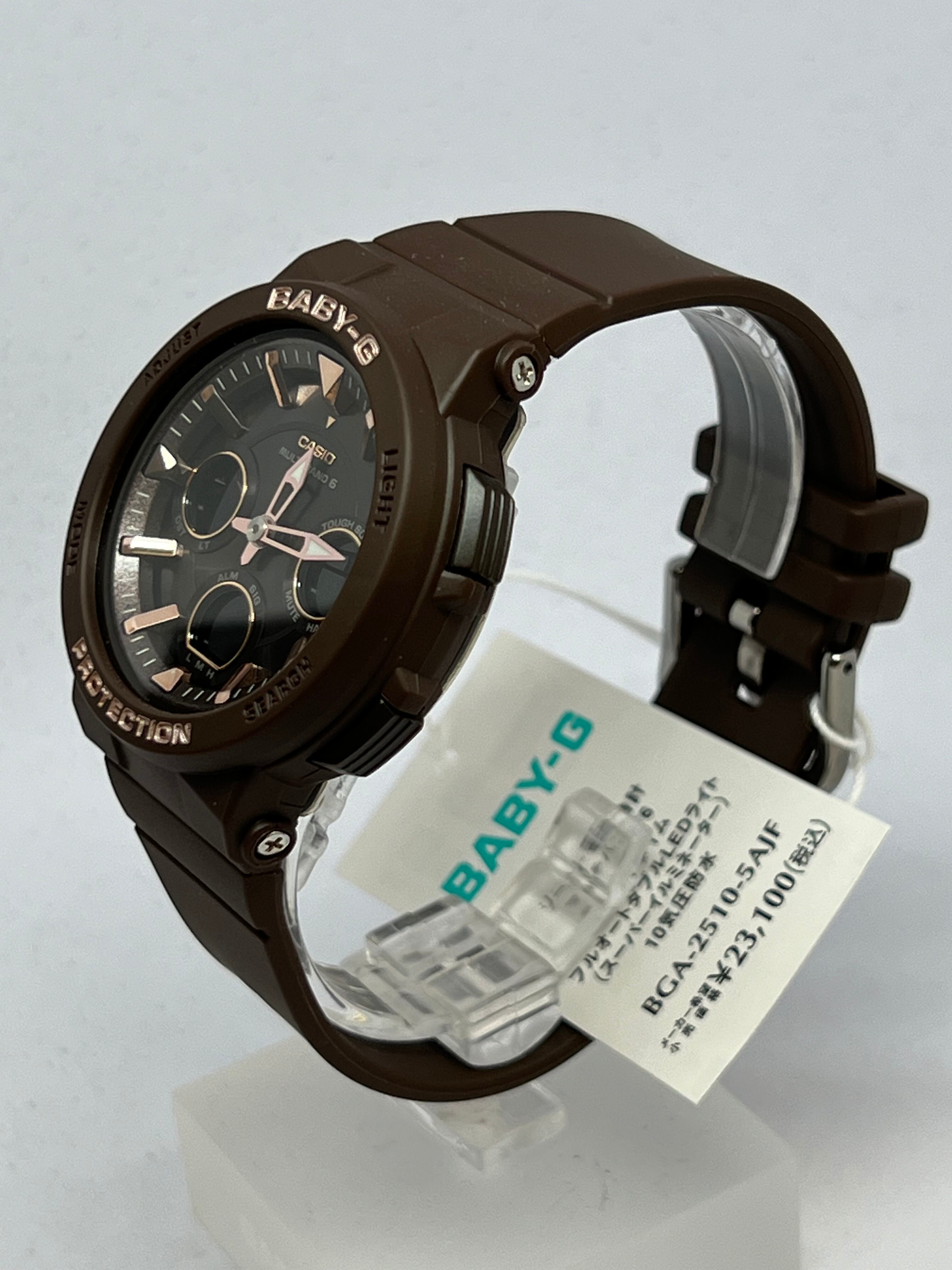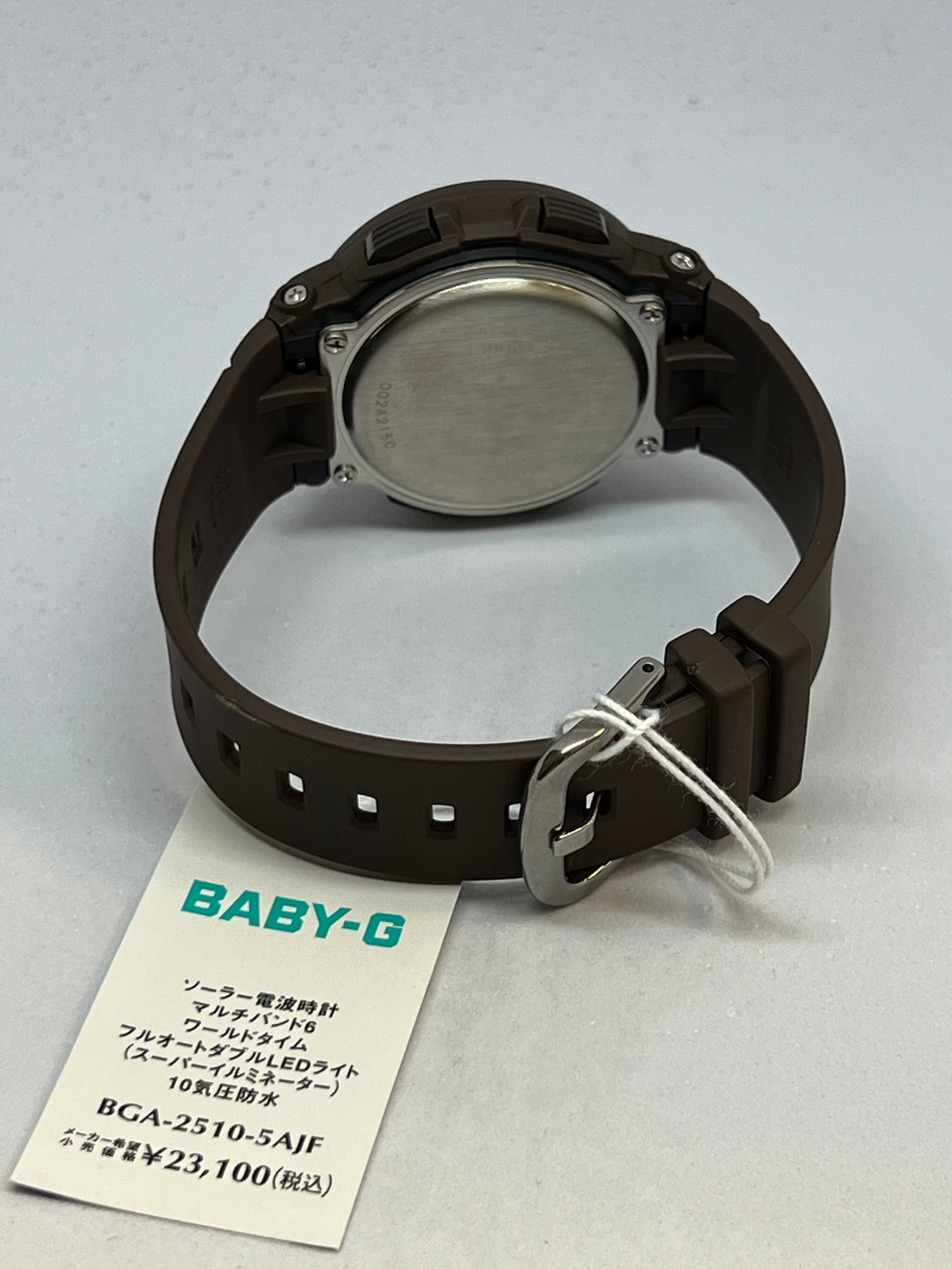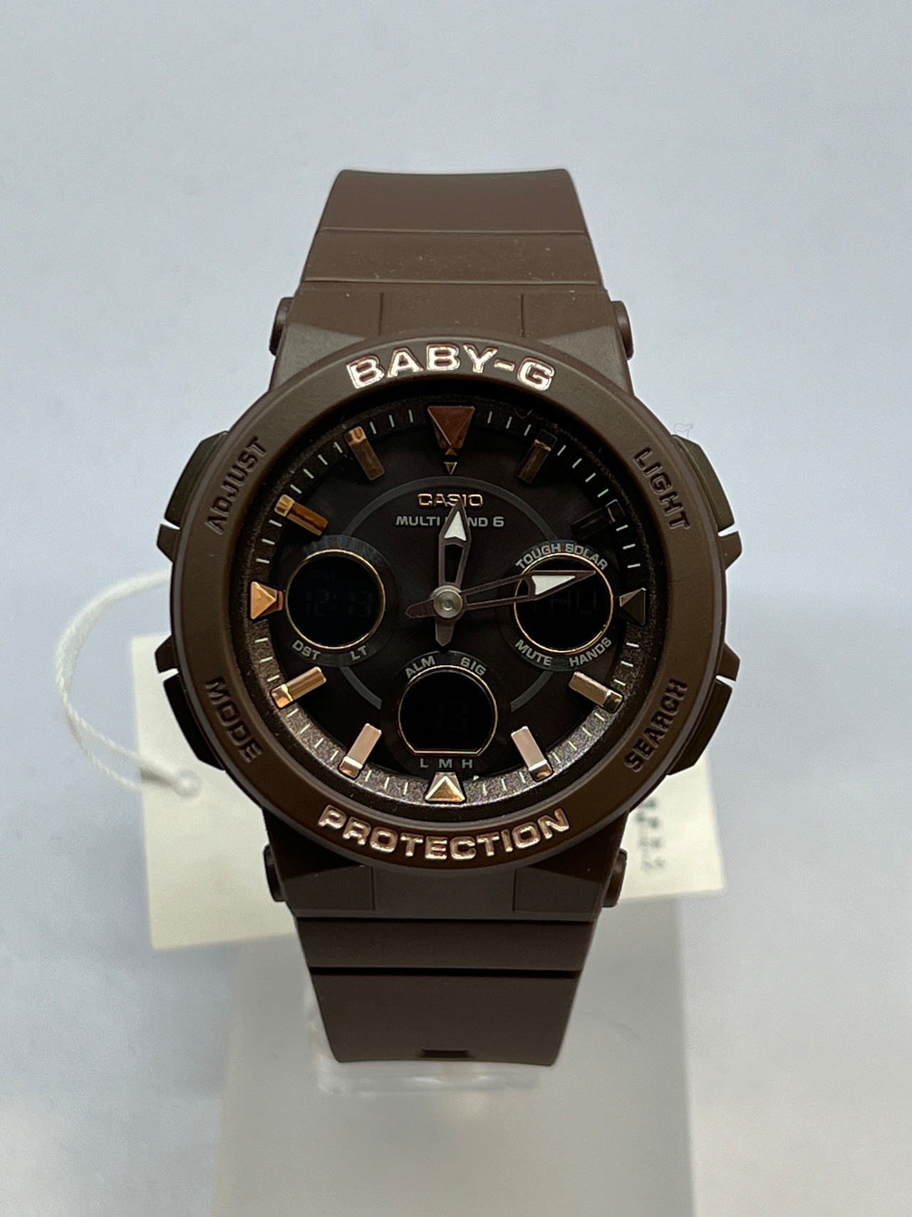 フェイスが大きく視認性が良い電波ソーラーモデルです。ブラウンをベースカラーに、華やかなピンクゴールドでアクセント。インデックスは立体デザインで、スポーティーな印象をプラスしました。機能面では、世界6局の電波を受信し時刻を自動修正するマルチバンド6、ワールドタイム、タフソーラー等、頼れる機能を備えています。