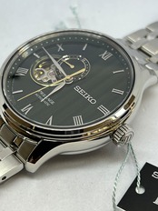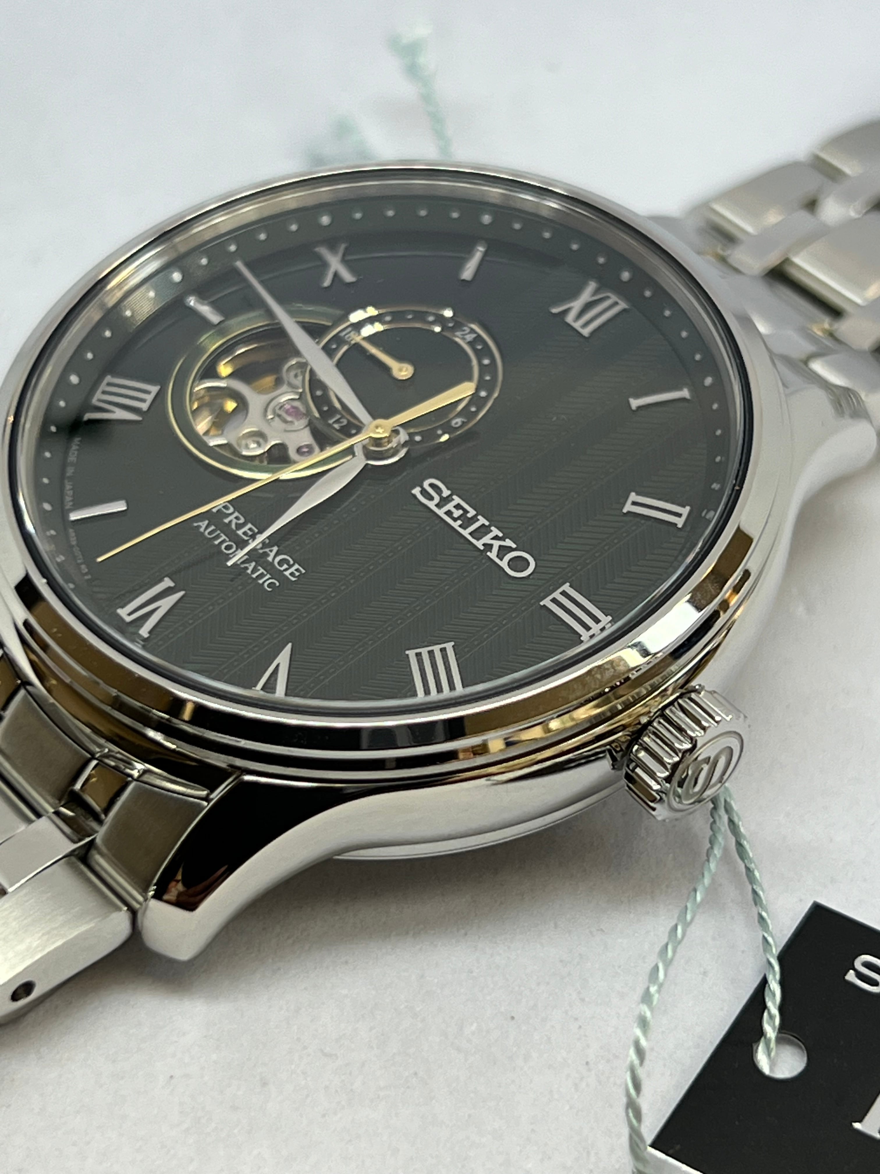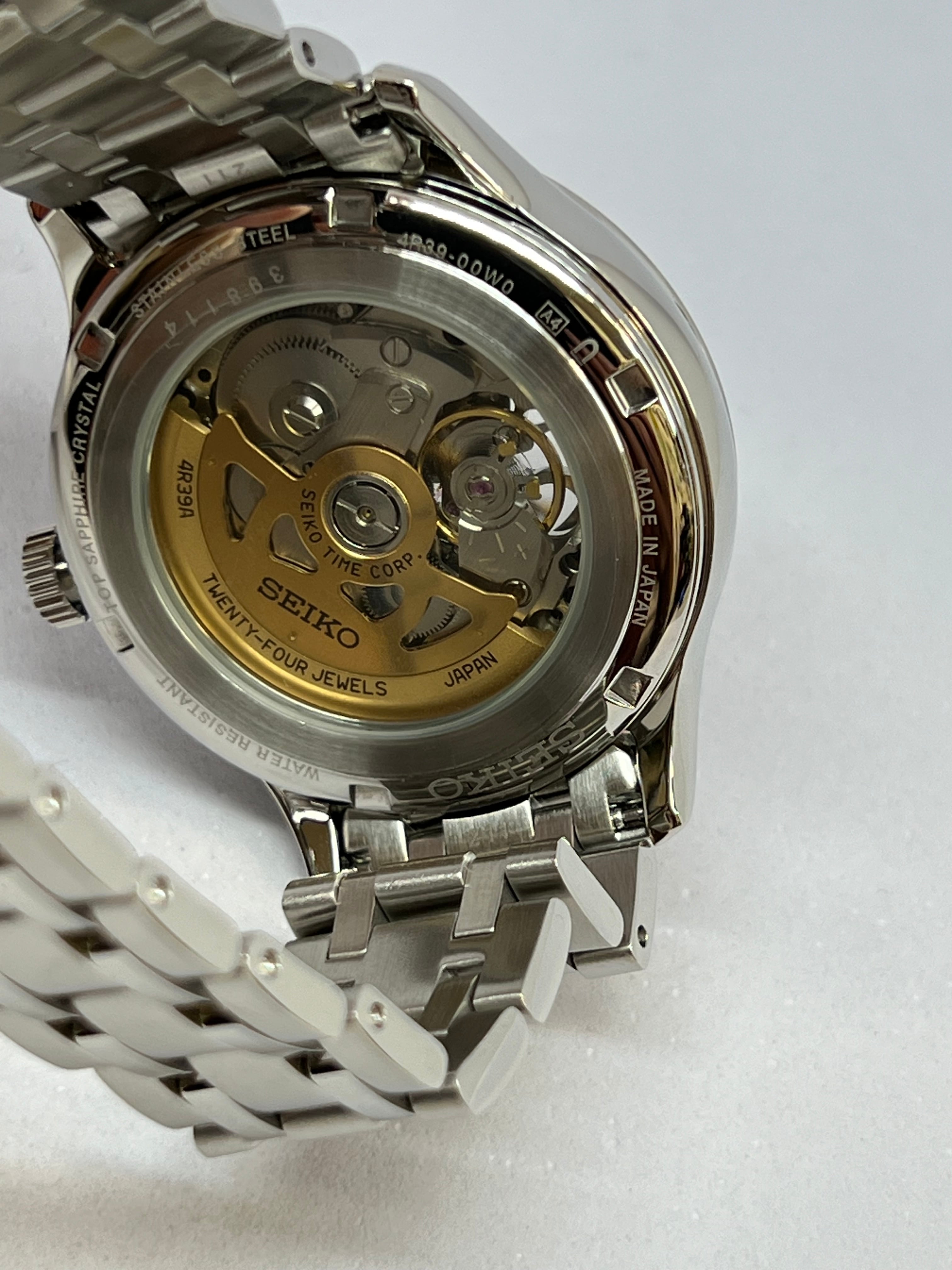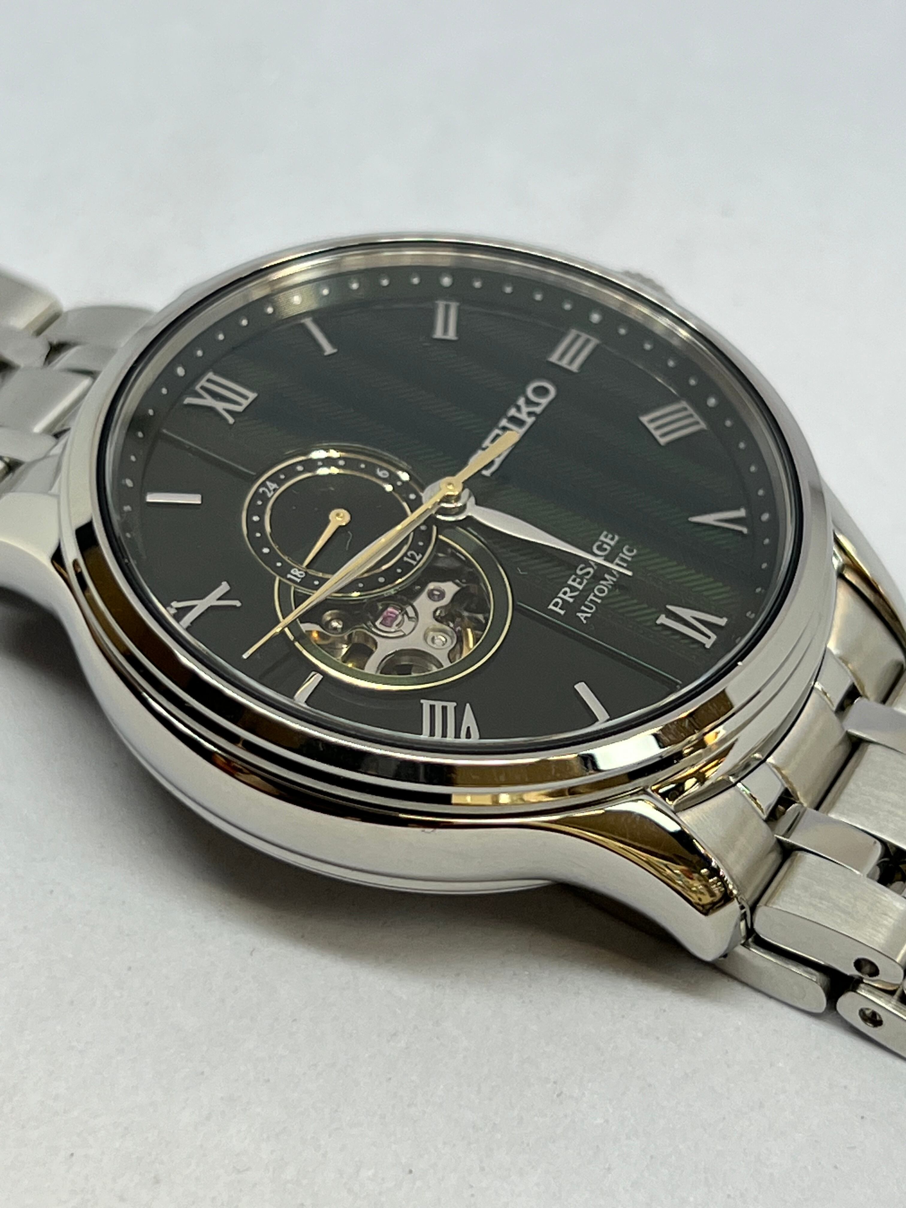 最近流行りのグリーンダイヤルの時計です。ぱっと見はそんな感じですが・・この美しさは写真では伝わらないと思います。(写真がんばります('◇')ゞ)日本人ならではの砂紋パターンを文字盤に落とし込んで日本庭園をイメージしております。オープンハートと24時間計の配置など凝ったデザイン・・そしてカーブサファイアガラスが美しさを際立たせます!