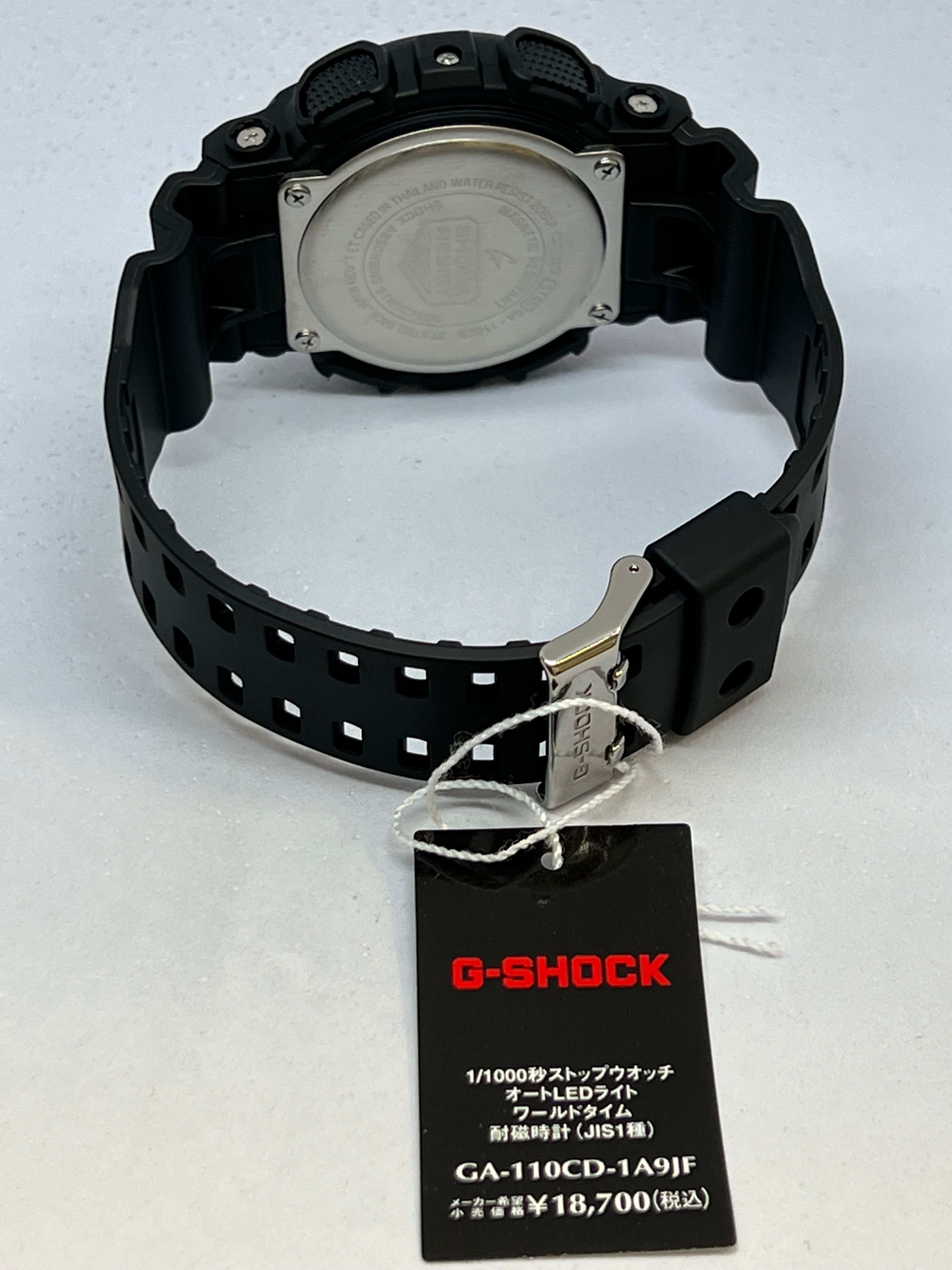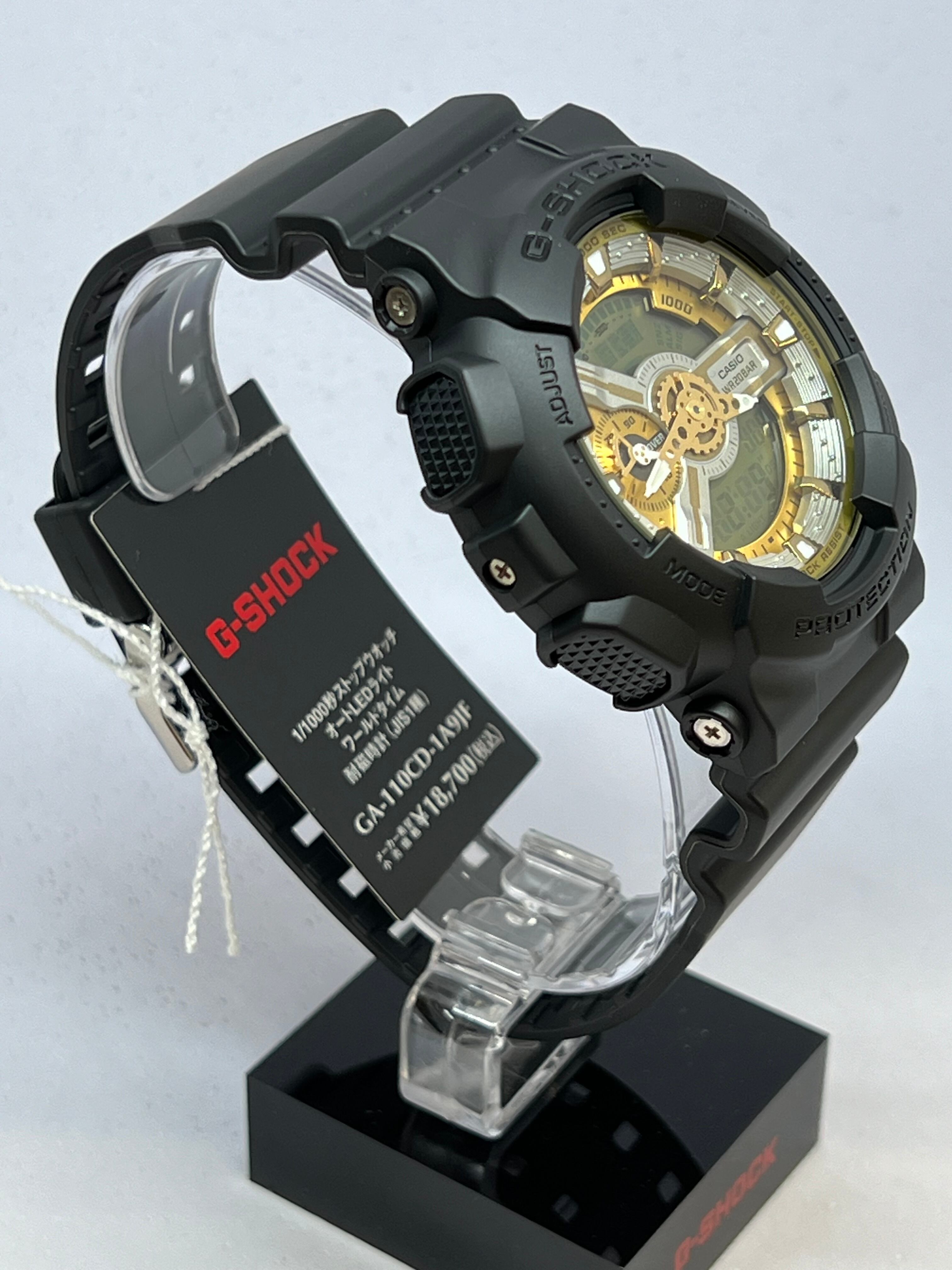 タフネスを追求し進化を続けるG-SHOCKから、存在感のあるビッグケースが人気のGA-110です。定番のブラックのバンドとベゼルを採用。立体的なフェイスデザインはシルバーとゴールドでゴージャスに仕上げました。