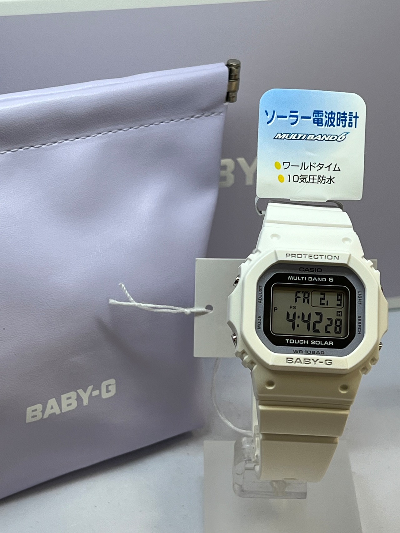 ホワイトベースに薄紫色をアクセントカラーに取り入れた、爽やかで春らしいカラーリングに仕上げました。機能面では、耐衝撃構造や10気圧防水、世界6局の電波を受信し時刻を自動修正するマルチバンド6、ワールドタイム、タフソーラー等、頼れる機能を備えています。