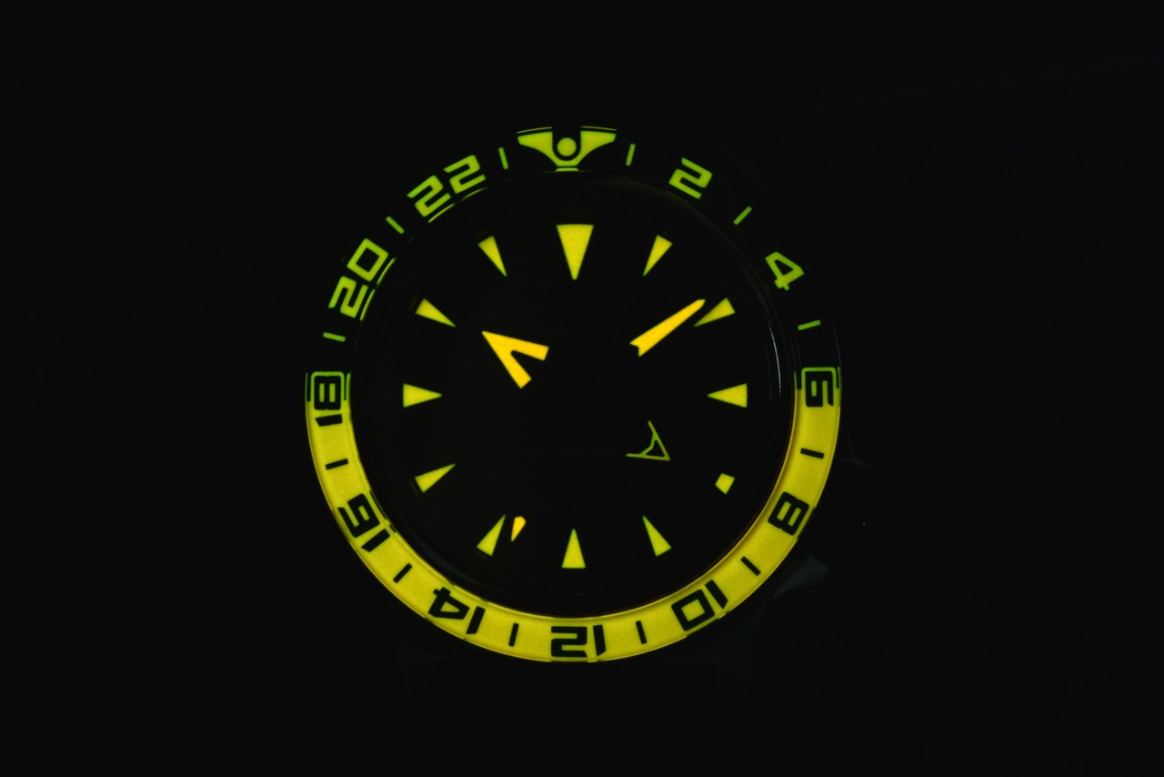 夜間は強蓄光によりベゼル本体が発光し、針とインデックスに塗布された強蓄光はモデルにより発光色が異なります。