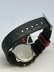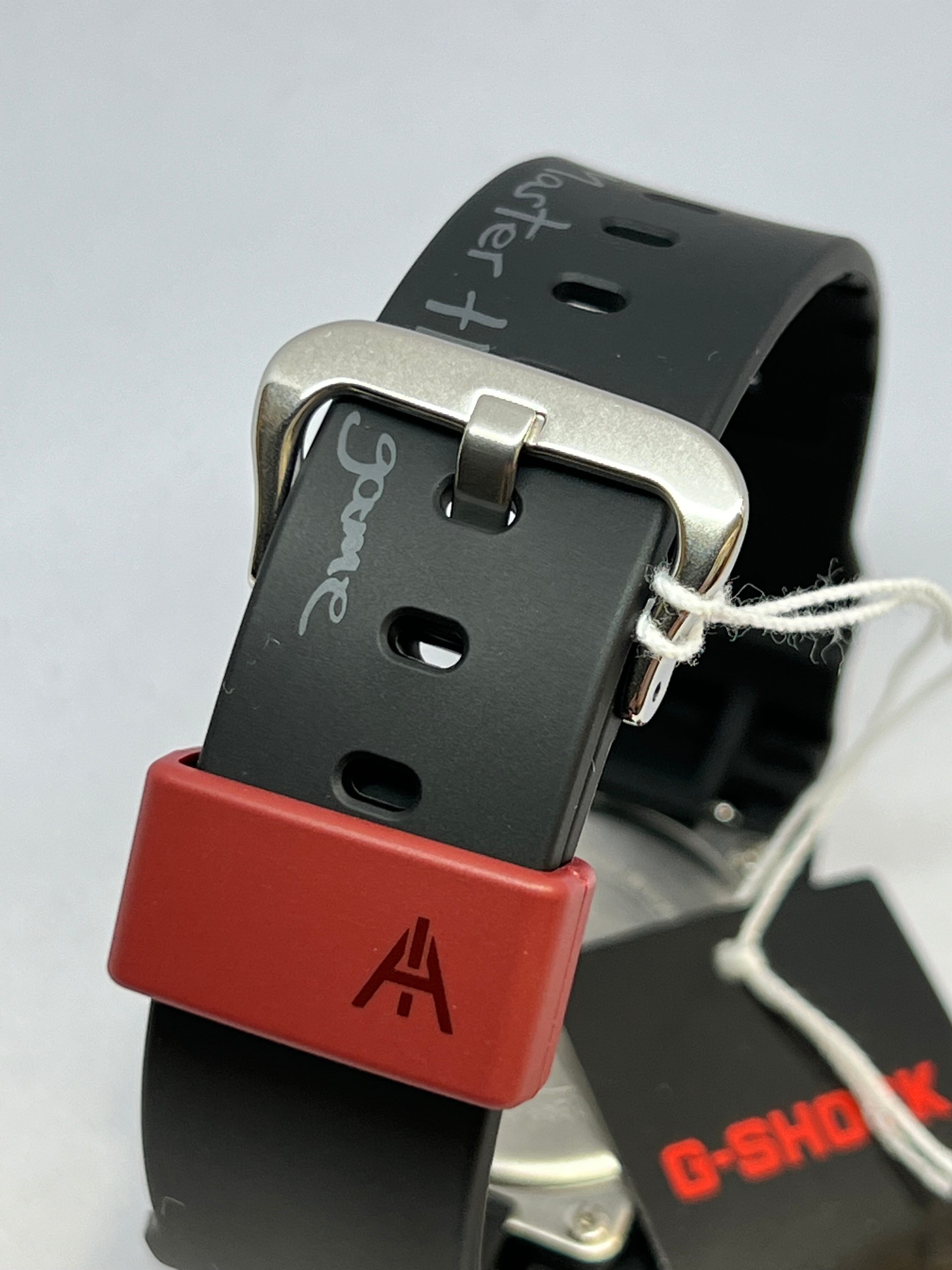ベースモデルにG-SHOCKを代表するDW-5600を採用。ベースカラーのブラックにイメージカラーであるレッドを随所にあしらい、バンドにはイニエスタ選手を象徴するワード、‘’Master the game‘’の直筆をプリント。遊環にはオリジナルのロゴ、バックライトにはイニエスタ選手のシルエットが浮かび上がる仕様にしました。また、8時側のサイドボタンには背番号8をレーザー刻印し、ディテールを随所に取り込みました。