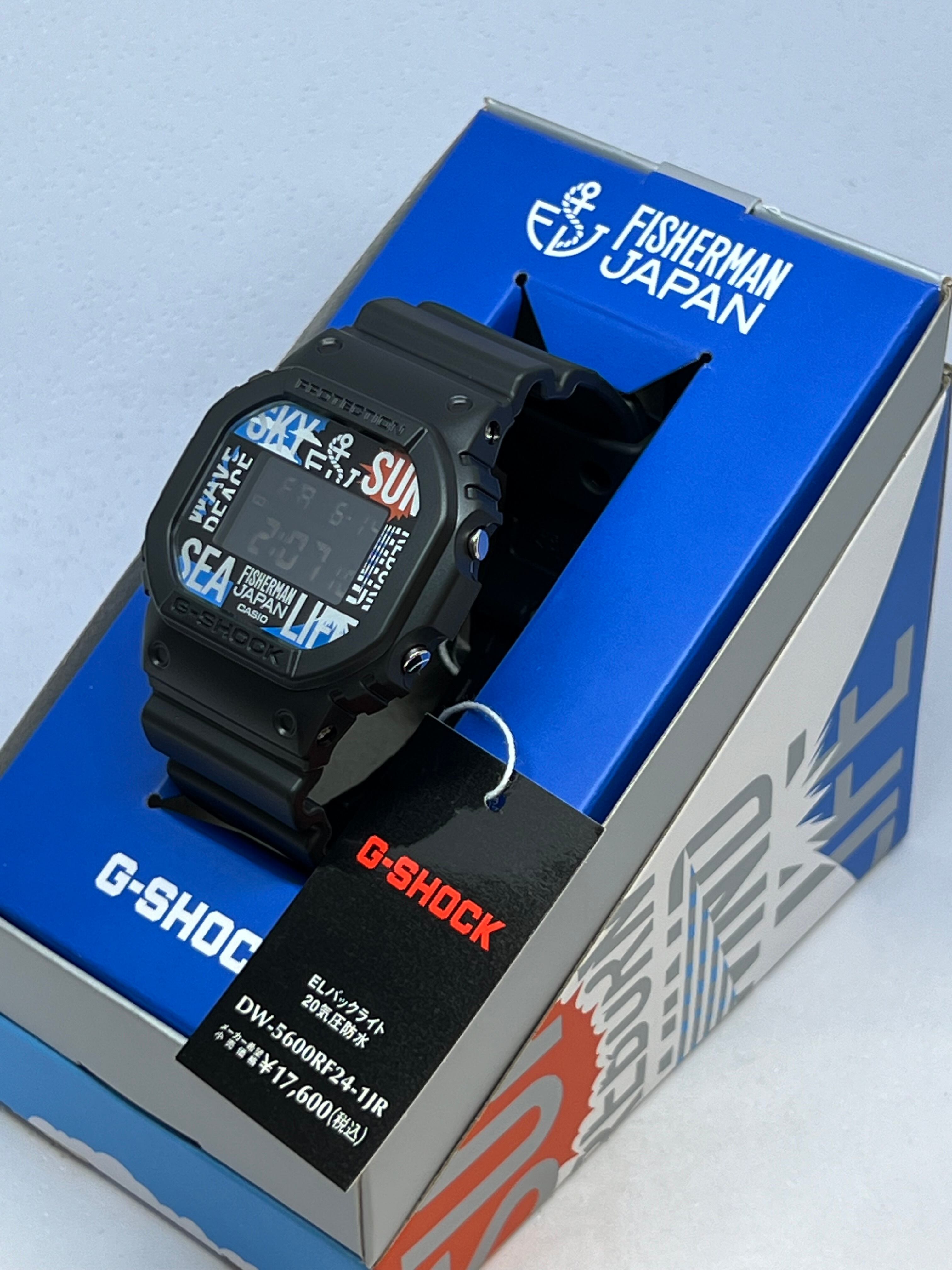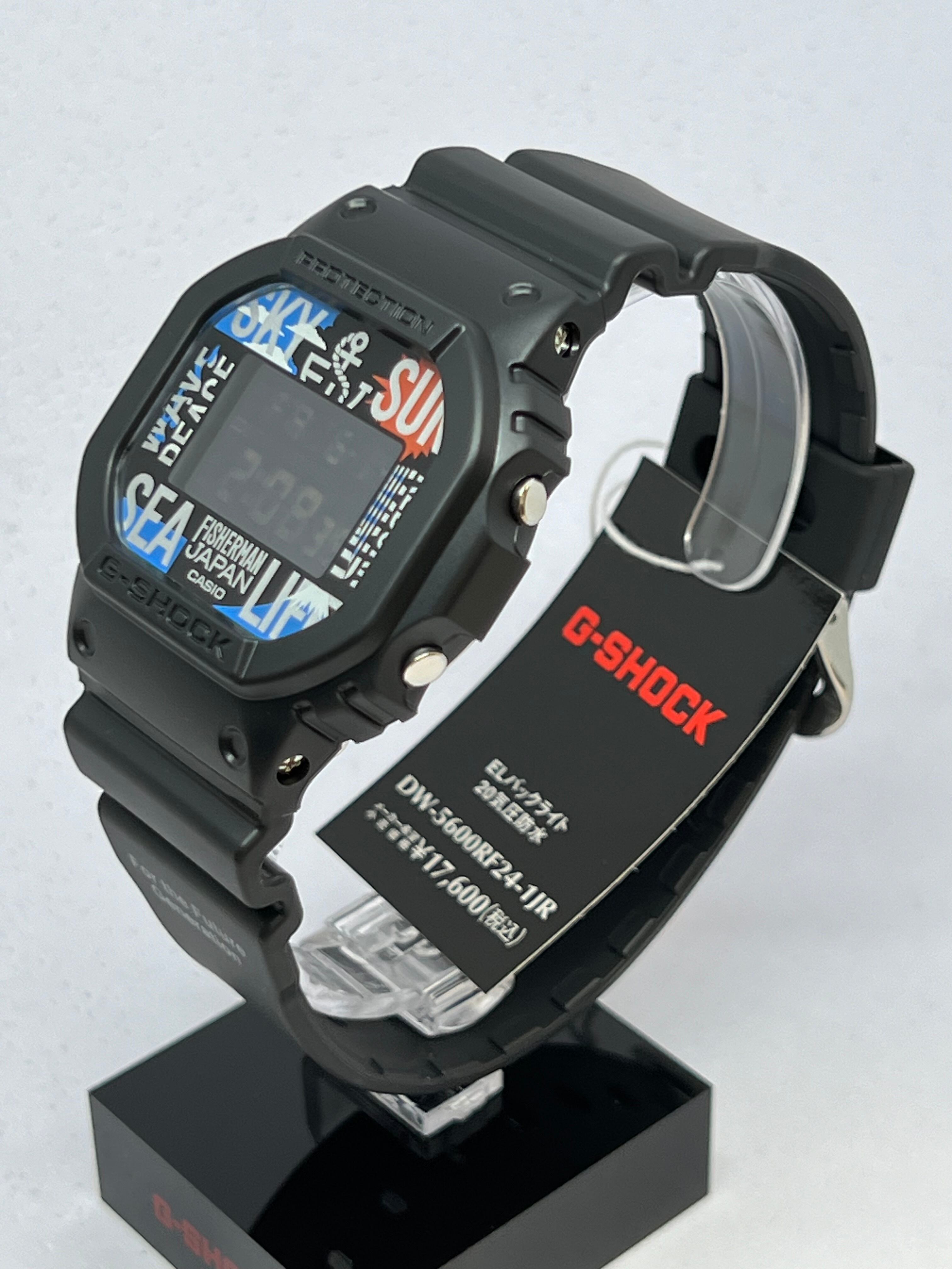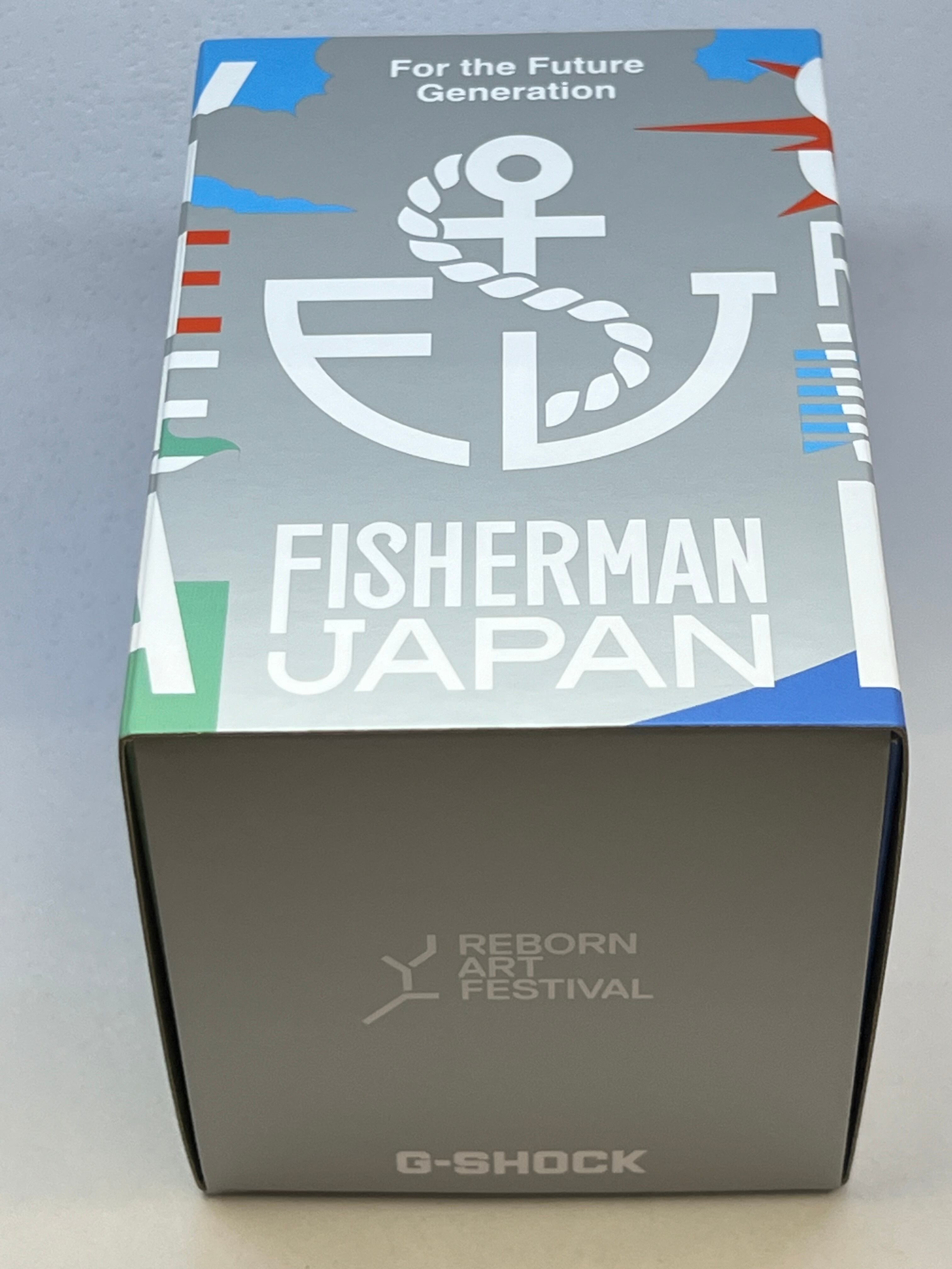 ベースモデルにはDW-5600を採用。大漁旗を時計のフェイスに落とし込み、下側のバンドの付け根にはFISHERMAN JAPANのメッセージである「For the Future Generation」を配しました。裏蓋にはReborn-Art Festivalのロゴを刻印。また、液晶部分やバンド印刷をブラックにすることでフェイスデザインを際立たせました。大漁旗をモチーフにしたオリジナルパッケージ付きのスペシャルモデルです。