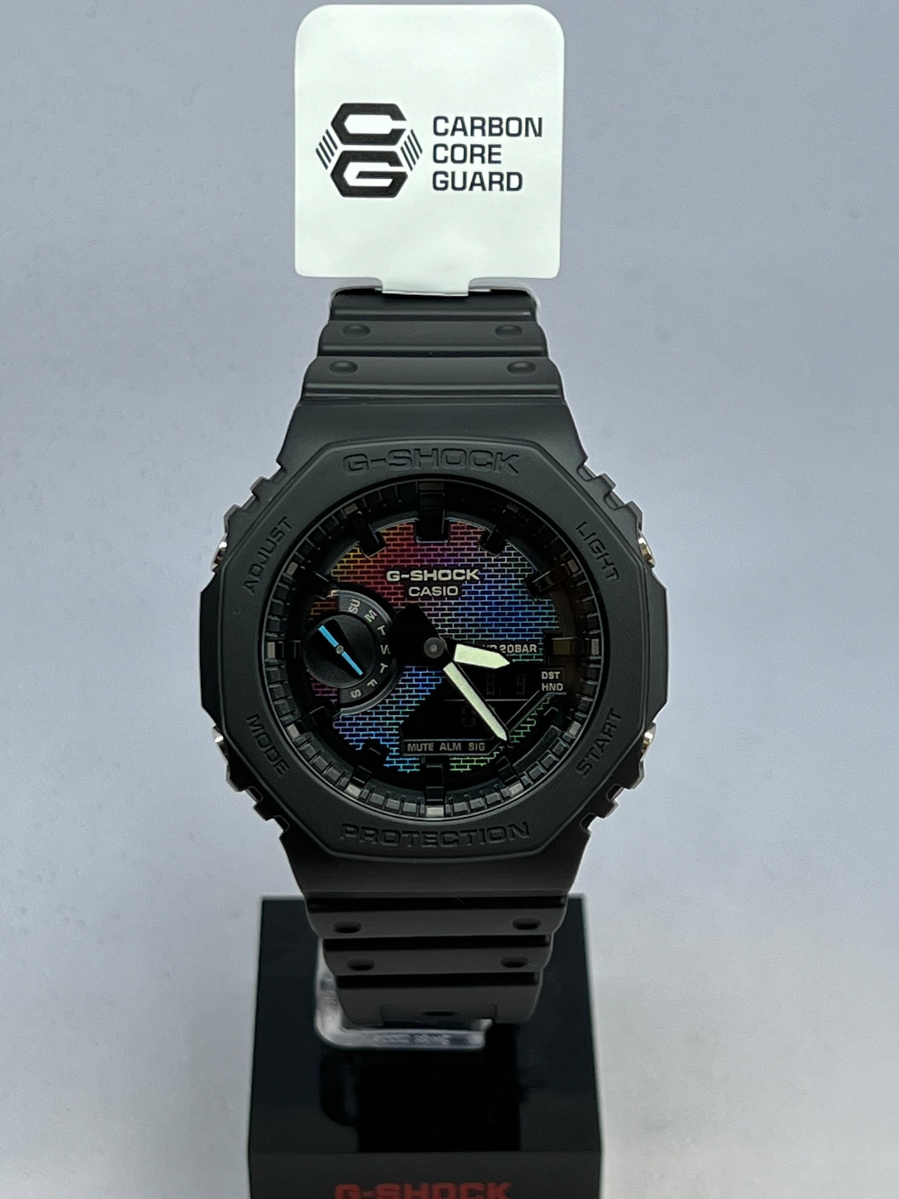 光の反射によりさまざまな色合いを見せるレインボーカラーのグラデーション蒸着により、G-SHOCKの初号機にも使用されているレンガパターンを印刷。壁を乗り越えて常に限界を超えていくタフネススピリットを表現しました。