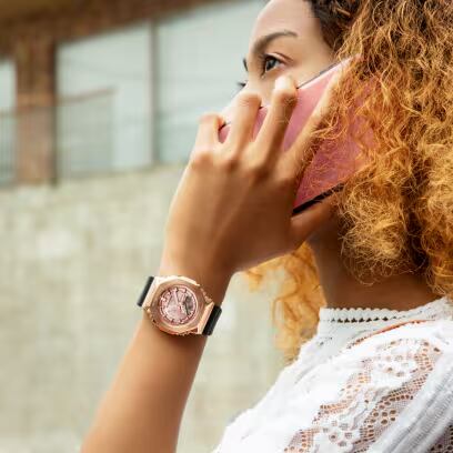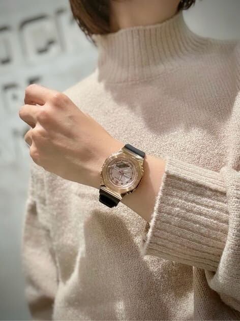 GA-2100シリーズの中でも、どんなシーンにもフィットするよう小型化、薄型化に徹底的にこだわったGMA-S2100をベースにベゼルカバー部分に硬質なステンレス素材を採用し質感を向上。文字板に沿って円周上に入れたヘアライン加工により、ベゼルのIP加工の濃淡を表現しています。また、フラットな文字板にも蒸着処理を施し、スタイリッシュな印象に。更にインデックスにはミラー加工を施し華やかさをプラスしています。初代から受け継がれるコンセプトはそのままに、時計としてのクオリティを追求し外装や装着性の進化に磨きをかけたスタイリッシュモデルです。