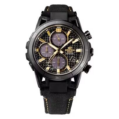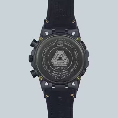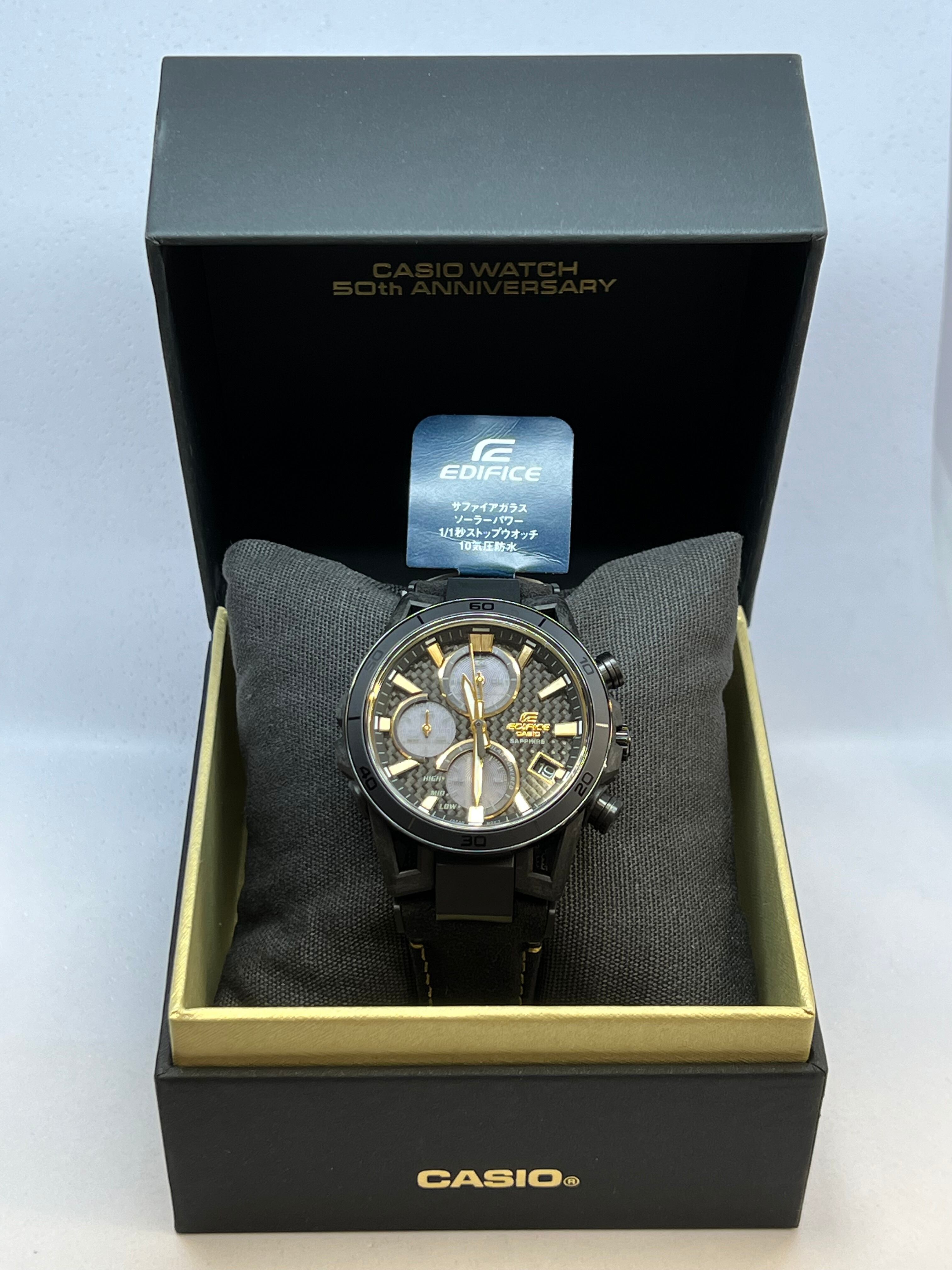 カシオウオッチ50周年を記念した限定モデル。新たな価値を生む「はじまりの灯火」をイメージし、黒とゴールドで表現したEDIFICEソーラークロノグラフです。