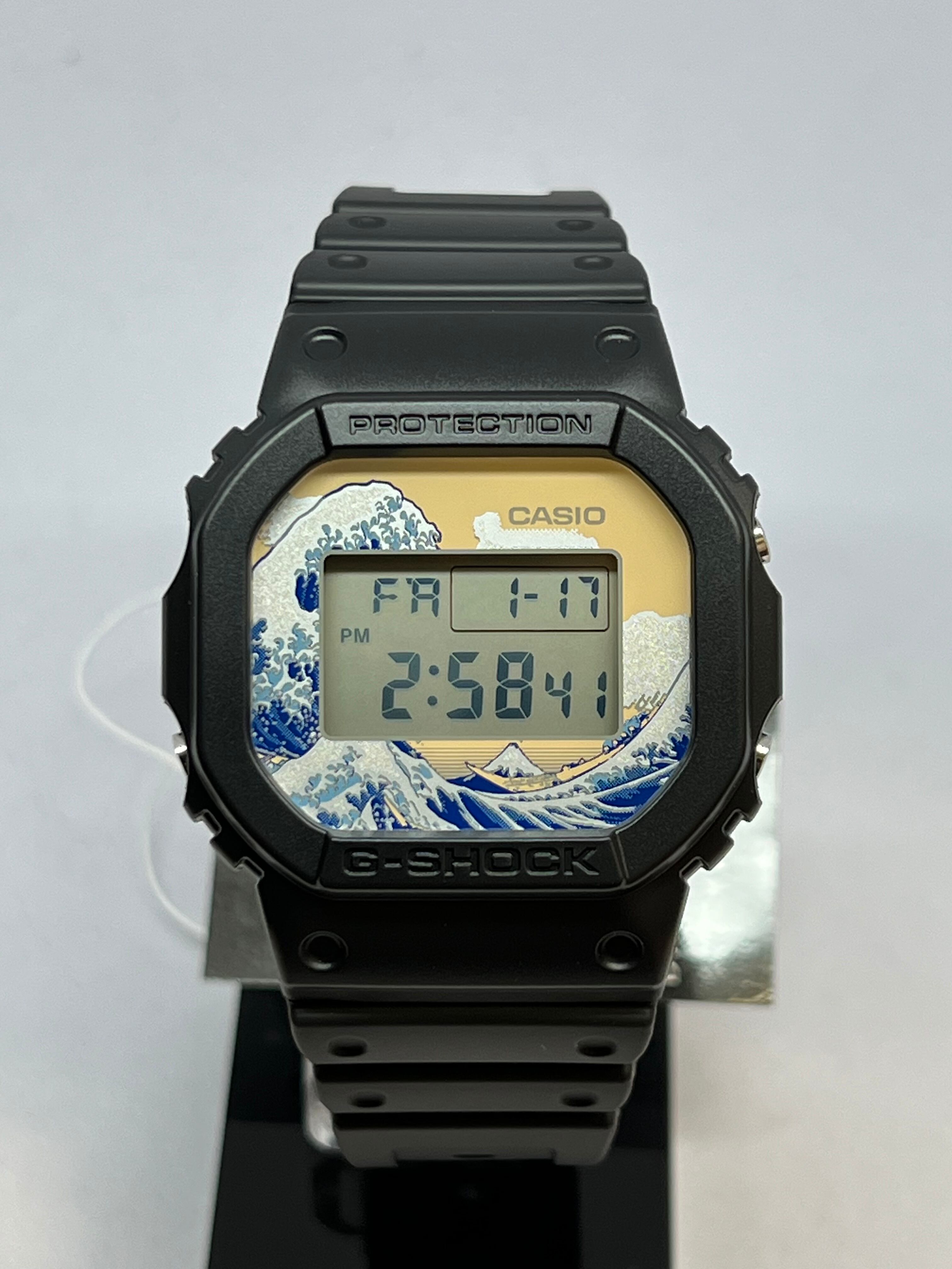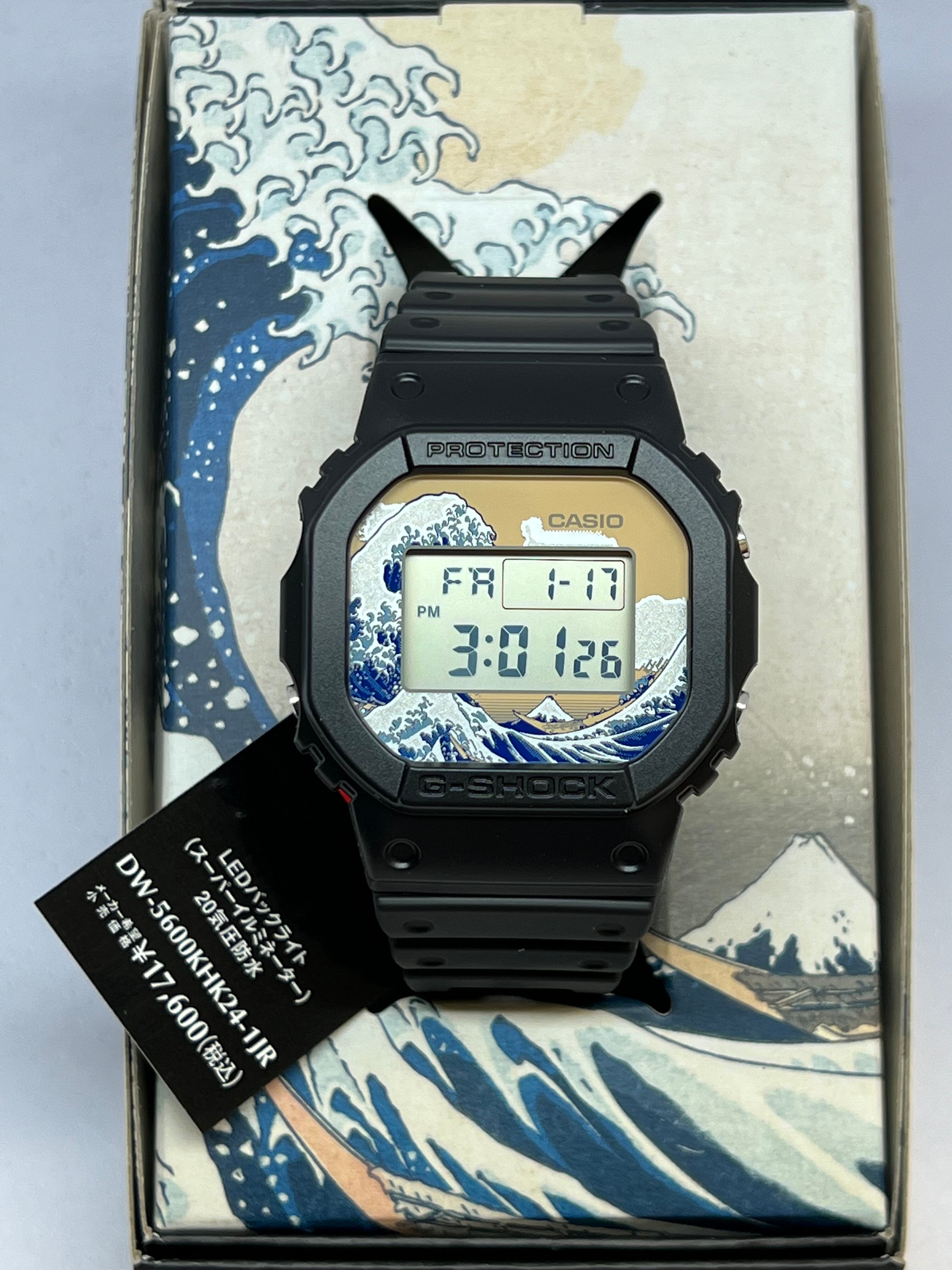 1983年の発売以来、飽くなき強さを求めて進化を続けるタフネスウオッチG-SHOCKから、江戸時代に活躍し国内外で広く知られている浮世絵画家、葛飾北斎の人気作品をデザインモチーフにしたモデルです。北斎の代表作である富嶽三十六景の中から「神奈川沖浪裏」を採用しました。